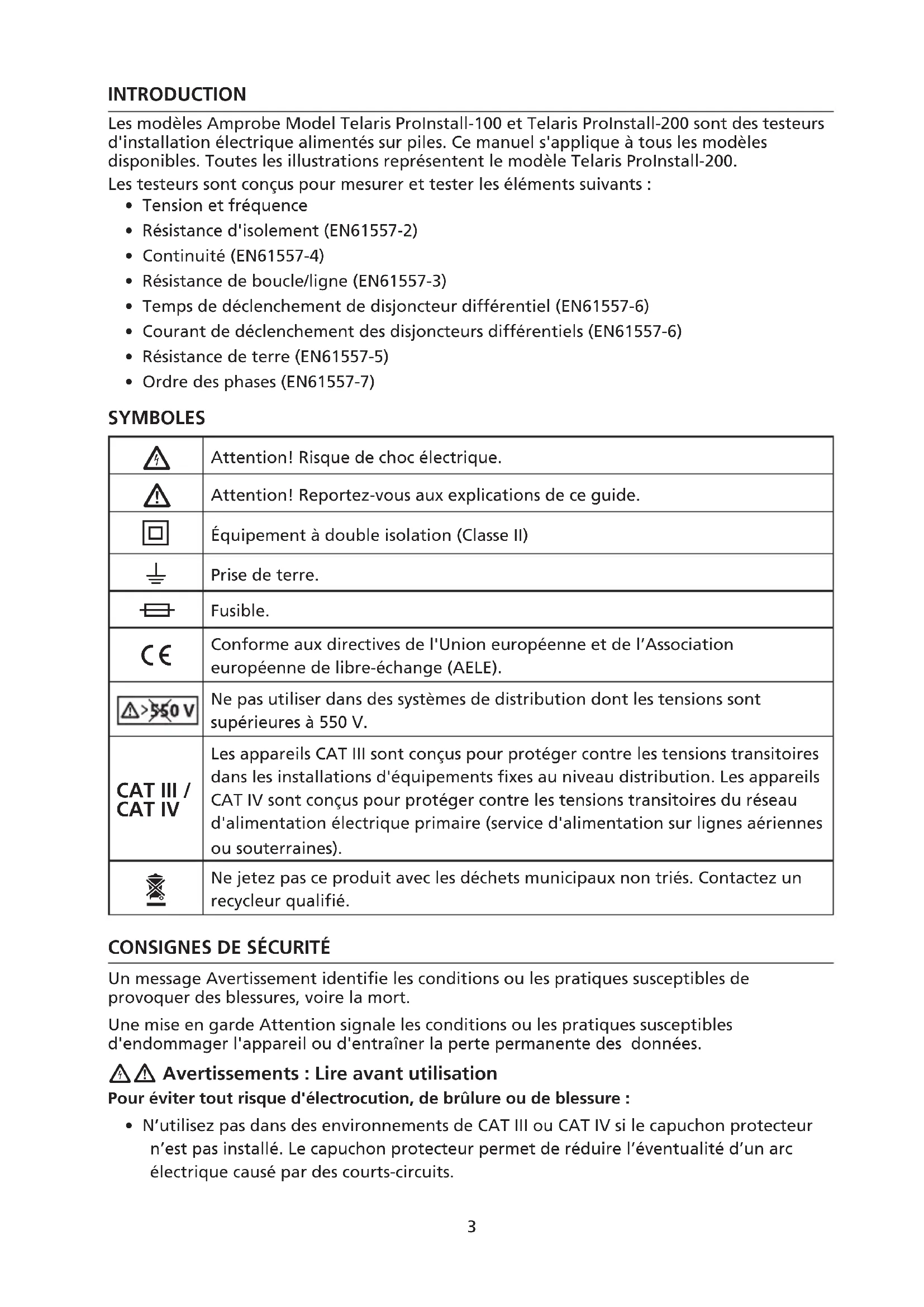 INTRODUCTIONLes modèles Amprobe Model Telaris ProInstall-100 et Telaris ProInstall-200 sont des testeurs d'installation électrique alimentés sur piles. Ce manuel s'applique à tous les modèles disponibles. Toutes les illustrations représentent le modèle Telaris ProInstall-200.Les testeurs sont conçus pour mesurer et tester les éléments suivants :• Tension et fréquence• Résistance d'isolement (EN61557-2)• Continuité (EN61557-4)• Résistance de boucle/ligne (EN61557-3)• Temps de déclenchement de disjoncteur différentiel (EN61557-6)• Courant de déclenchement des disjoncteurs différentiels (EN61557-6)• Résistance de terre (EN61557-5)• Ordre des phases (EN61557-7)SYMBOLES Attention! Risque de choc électrique. Attention! Reportez-vous aux explications de ce guide. Équipement à double isolation (Classe II) Prise de terre. Fusible. Conforme aux directives de l'Union européenne et de l’Association européenne de libre-échange (AELE).Ne pas utiliser dans des systèmes de distribution dont les tensions sont supérieures à 550 V.CAT III / CAT IVLes appareils CAT III sont conçus pour protéger contre les tensions transitoires dans les installations d'équipements fixes au niveau distribution. Les appareils CAT IV sont conçus pour protéger contre les tensions transitoires du réseau d'alimentation électrique primaire (service d'alimentation sur lignes aériennes ou souterraines). Ne jetez pas ce produit avec les déchets municipaux non triés. Contactez un recycleur qualifié.CONSIGNES DE SÉCURITÉUn message Avertissement identifie les conditions ou les pratiques susceptibles de provoquer des blessures, voire la mort.Une mise en garde Attention signale les conditions ou les pratiques susceptibles d'endommager l'appareil ou d'entraîner la perte permanente des données. W Avertissements : Lire avant utilisation Pour éviter tout risque d'électrocution, de brûlure ou de blessure :• N’utilisez pas dans des environnements de CAT III ou CAT IV si le capuchon protecteur n’est pas installé. Le capuchon protecteur permet de réduire l’éventualité d’un arc électrique causé par des courts-circuits.4