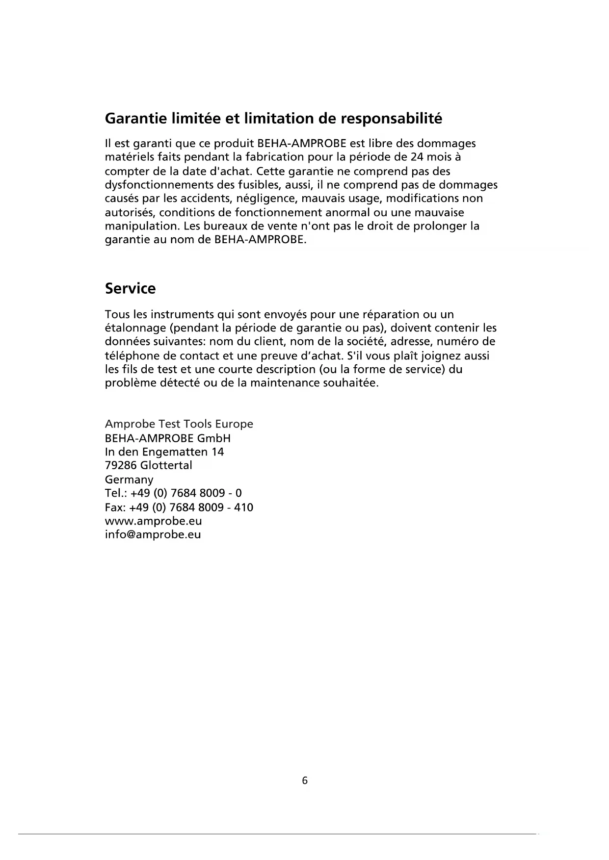 Garantie limitée et limitation de responsabilité Il est garanti que ce produit BEHA-AMPROBE est libre des dommages matériels faits pendant la fabrication pour la période de 24 mois à compter de la date d'achat. Cette garantie ne comprend pas des dysfonctionnements des fusibles, aussi, il ne comprend pas de dommages causés par les accidents, négligence, mauvais usage, modifications non autorisés, conditions de fonctionnement anormal ou une mauvaise manipulation. Les bureaux de vente n'ont pas le droit de prolonger la garantie au nom de BEHA-AMPROBE.