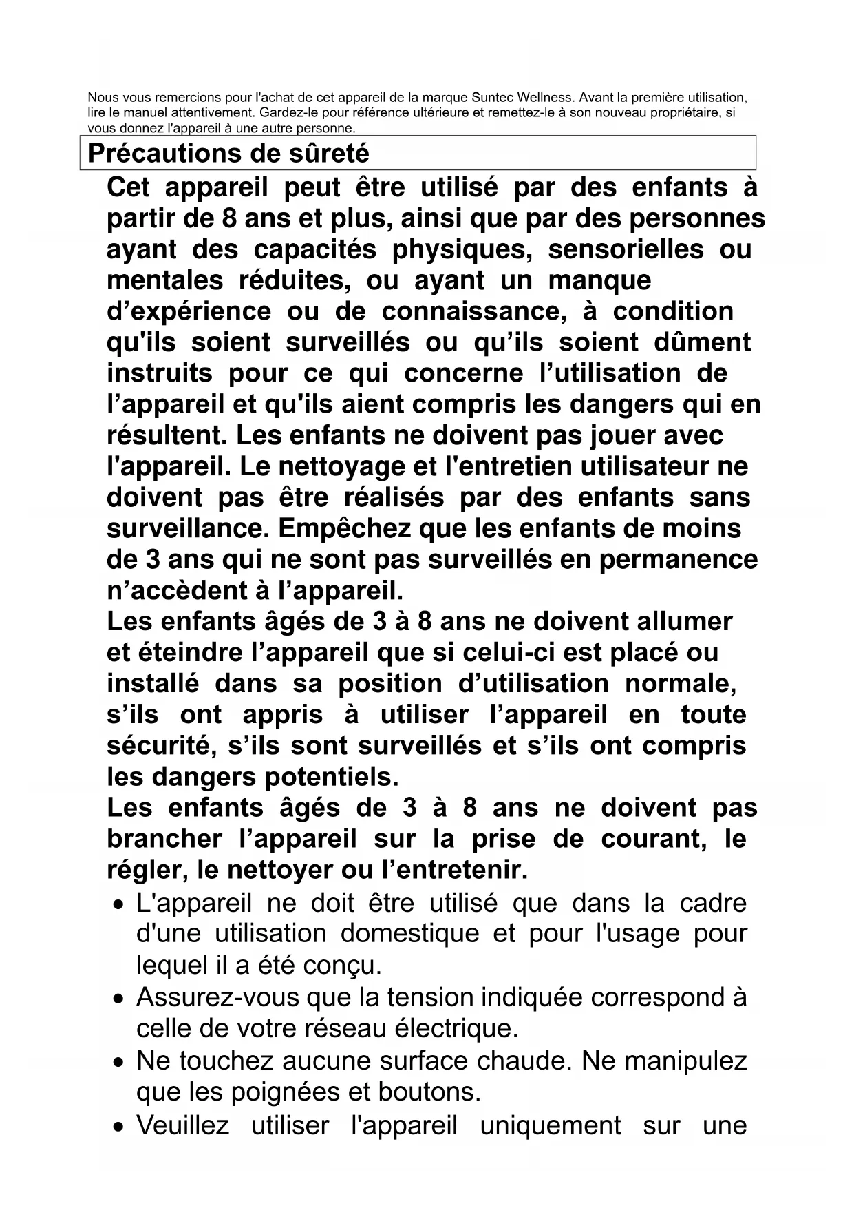 Mode d‘emploiNous vous remercions pour l'achat de cet appareil de la marque Suntec Wellness. Avant la première utilisation, lire le manuel attentivement. Gardez-le pour référence ultérieure et remettez-le à son nouveau propriétaire, si vous donnez l'appareil à une autre personne. Précautions de sûreté Cet appareil peut être utilisé par des enfants à partir de 8 ans et plus, ainsi que par des personnes ayant des capacités physiques, sensorielles ou mentales réduites, ou ayant un manque d’expérience ou de connaissance, à condition qu'ils soient surveillés ou qu’ils soient dûment instruits pour ce qui concerne l’utilisation de l’appareil et qu'ils aient compris les dangers qui en résultent. Les enfants ne doivent pas jouer avec l'appareil. Le nettoyage et l'entretien utilisateur ne doivent pas être réalisés par des enfants sans surveillance. Empêchez que les enfants de moins de 3 ans qui ne sont pas surveillés en permanence n’accèdent à l’appareil. Les enfants âgés de 3 à 8 ans ne doivent allumer et éteindre l’appareil que si celui-ci est placé ou installé dans sa position d’utilisation normale, s’ils ont appris à utiliser l’appareil en toute sécurité, s’ils sont surveillés et s’ils ont compris les dangers potentiels. Les enfants âgés de 3 à 8 ans ne doivent pas brancher l’appareil sur la prise de courant, le régler, le nettoyer ou l’entretenir.