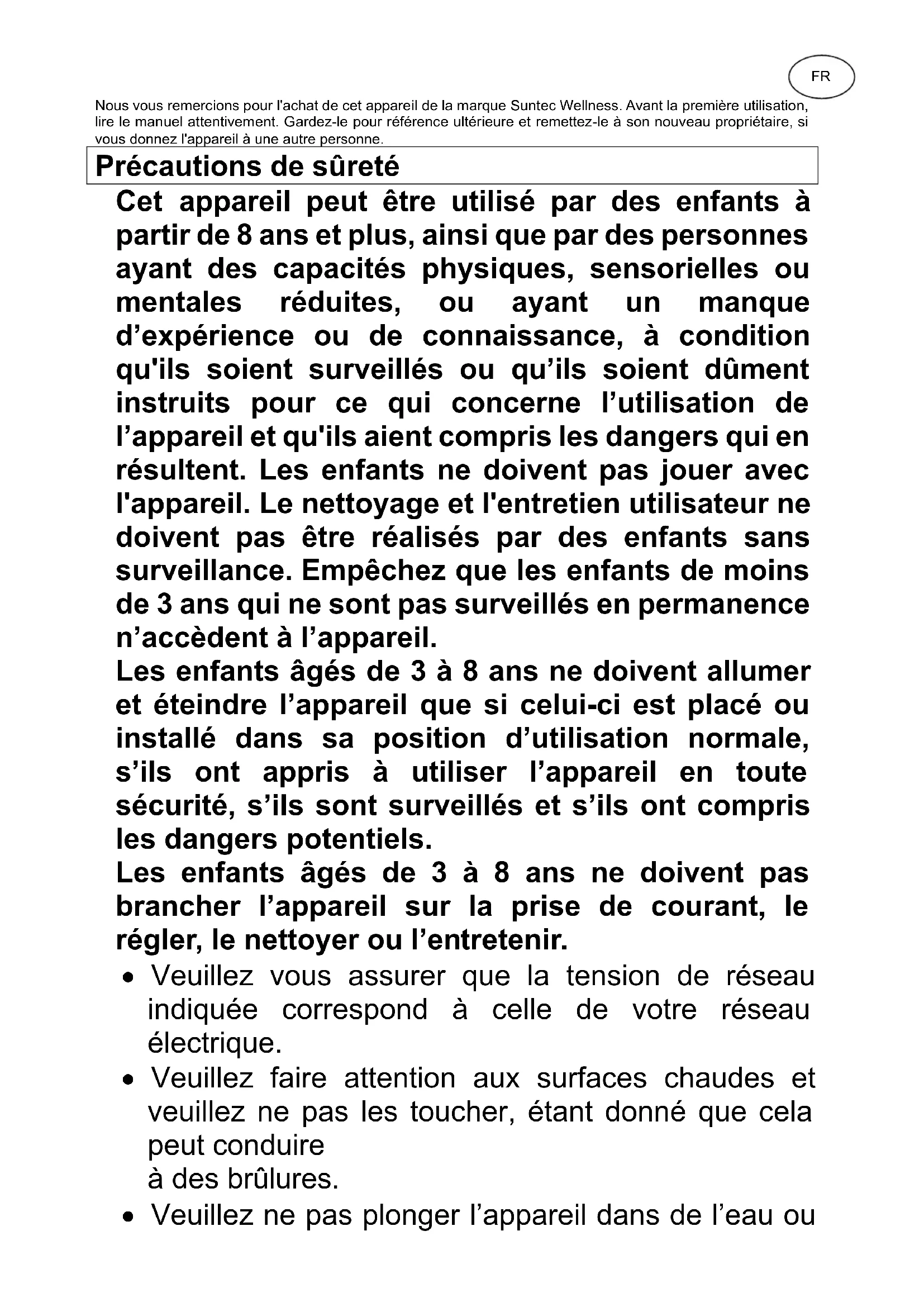 TLW-7024 masterclass SUNTEC WELLNESS GMBH / HOLZSTRASSE 2 / 40 221 DÜSSELDORF / GERMANIAFR Nous vous remercions pour l'achat de cet appareil de la marque Suntec Wellness. Avant la première utilisation, lire le manuel attentivement. Gardez-le pour référence ultérieure et remettez-le à son nouveau propriétaire, si vous donnez l'appareil à une autre personne. Précautions de sûreté Cet appareil peut être utilisé par des enfants à partir de 8 ans et plus, ainsi que par des personnes ayant des capacités physiques, sensorielles ou mentales réduites, ou ayant un manque d’expérience ou de connaissance, à condition qu'ils soient surveillés ou qu’ils soient dûment instruits pour ce qui concerne l’utilisation de l’appareil et qu'ils aient compris les dangers qui en résultent. Les enfants ne doivent pas jouer avec l'appareil. Le nettoyage et l'entretien utilisateur ne doivent pas être réalisés par des enfants sans surveillance. Empêchez que les enfants de moins de 3 ans qui ne sont pas surveillés en permanence n’accèdent à l’appareil. Les enfants âgés de 3 à 8 ans ne doivent allumer et éteindre l’appareil que si celui-ci est placé ou installé dans sa position d’utilisation normale, s’ils ont appris à utiliser l’appareil en toute sécurité, s’ils sont surveillés et s’ils ont compris les dangers potentiels. Les enfants âgés de 3 à 8 ans ne doivent pas brancher l’appareil sur la prise de courant, le régler, le nettoyer ou l’entretenir.