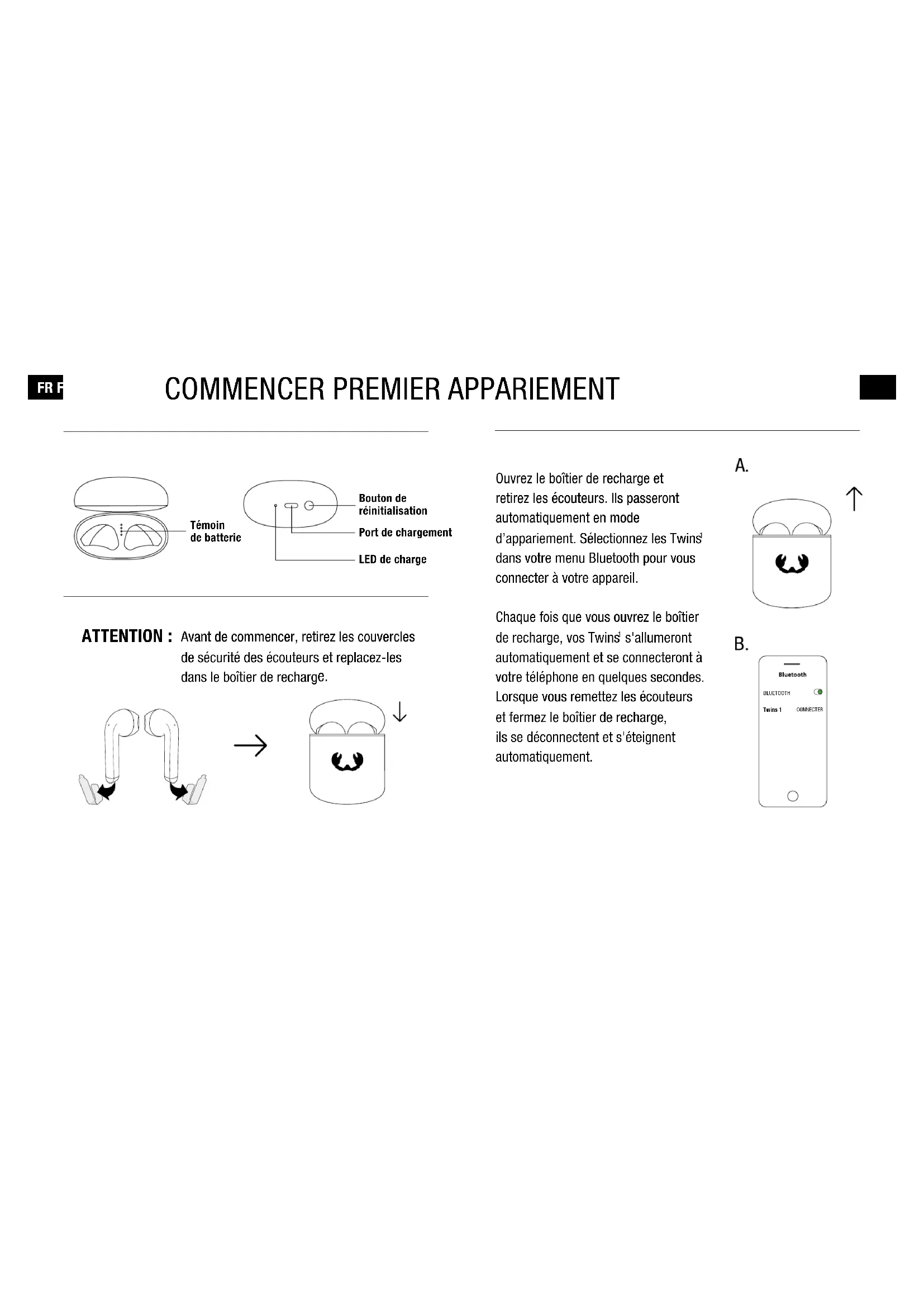 FR FR ATTENTION : Avant de commencer, retirez les couvercles de sécurité des écouteurs et replacez-les dans le boîtier de recharg