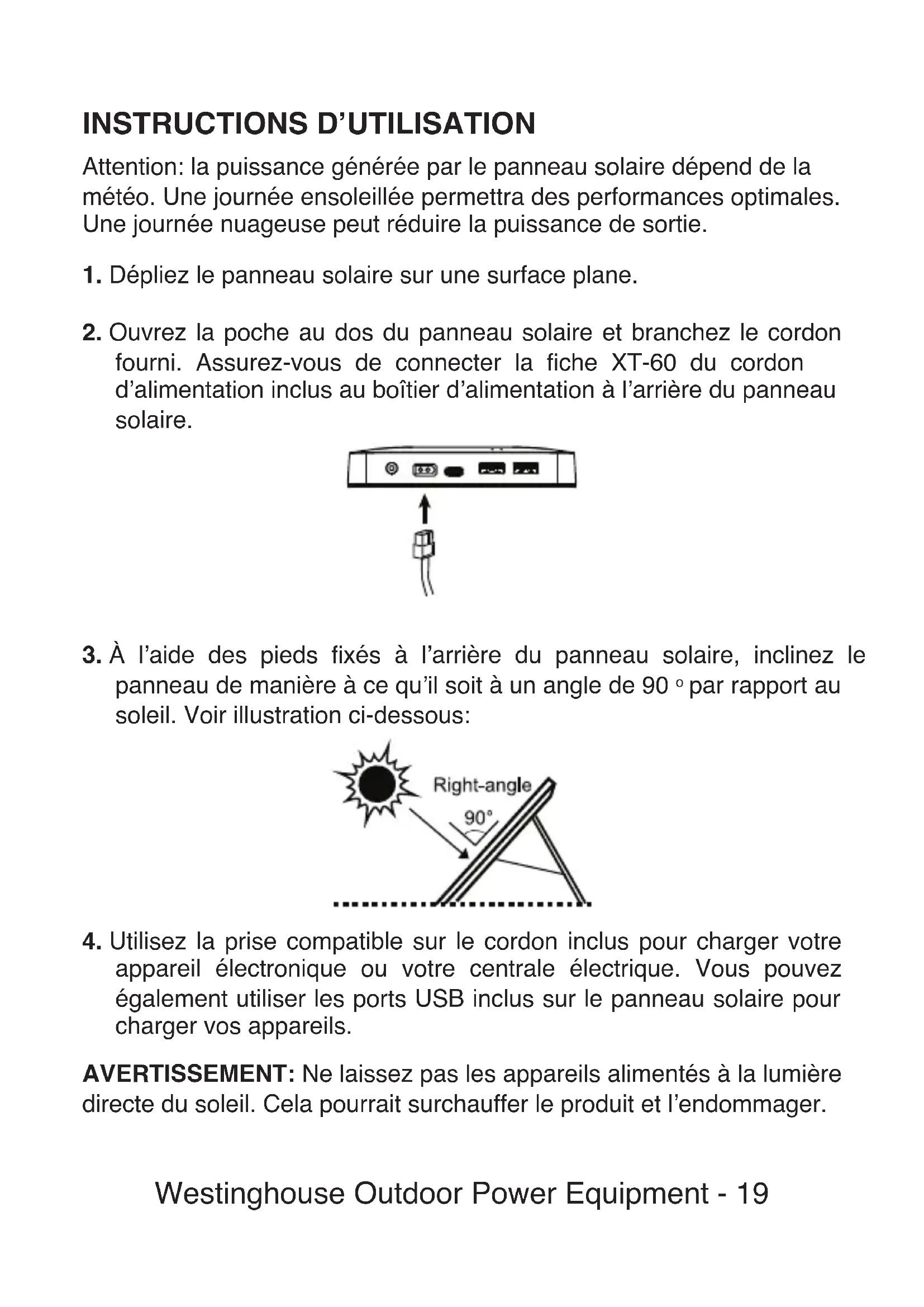 Merci d'avoir acheté le panneau solaire portable WSolar100p. Utilisez ce panneau solaire pour recharger vos centrales électriques portables Westinghouse à la maison ou en déplacement. Avant d'utiliser ce panneau solaire, veuillez lire attentivement le manuel d'utilisation. Gardez-le pour référence.