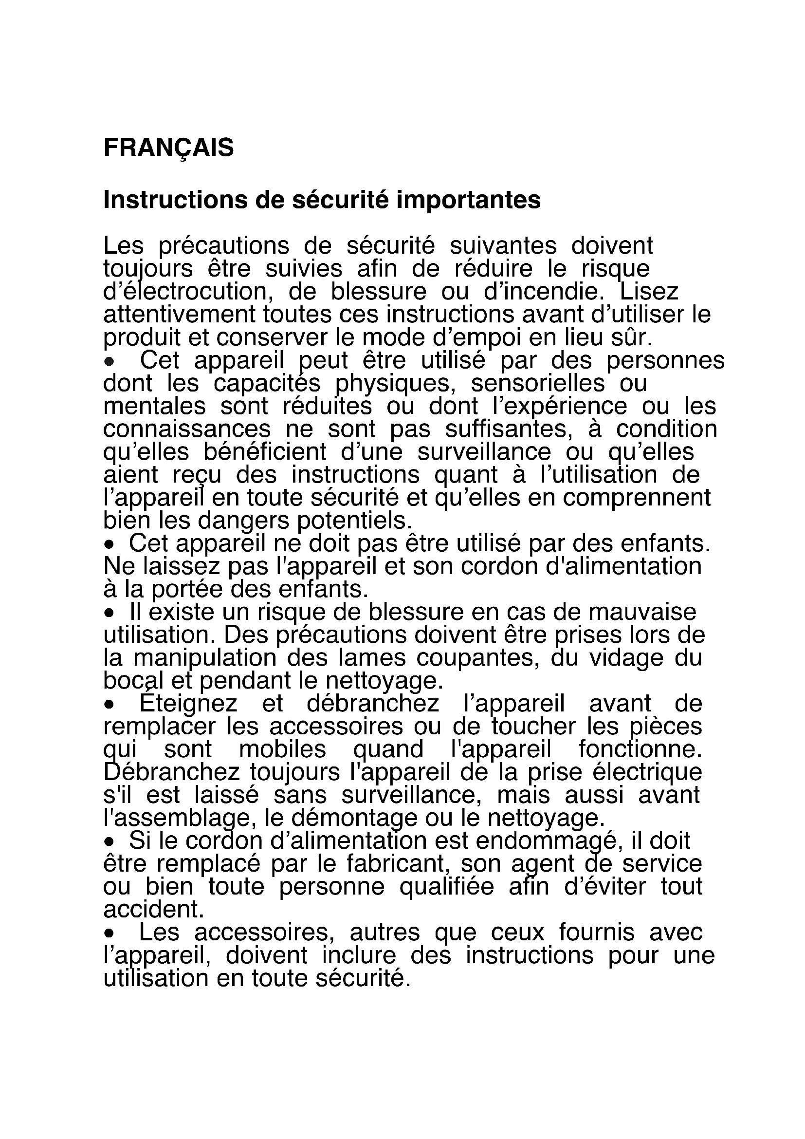 - Il existe un risque de blessure en cas de mauvaise utilisation. Des précautions doivent être prises lors de la manipulation des lames coupantes, du vidage du bocal et pendant le nettoyage.