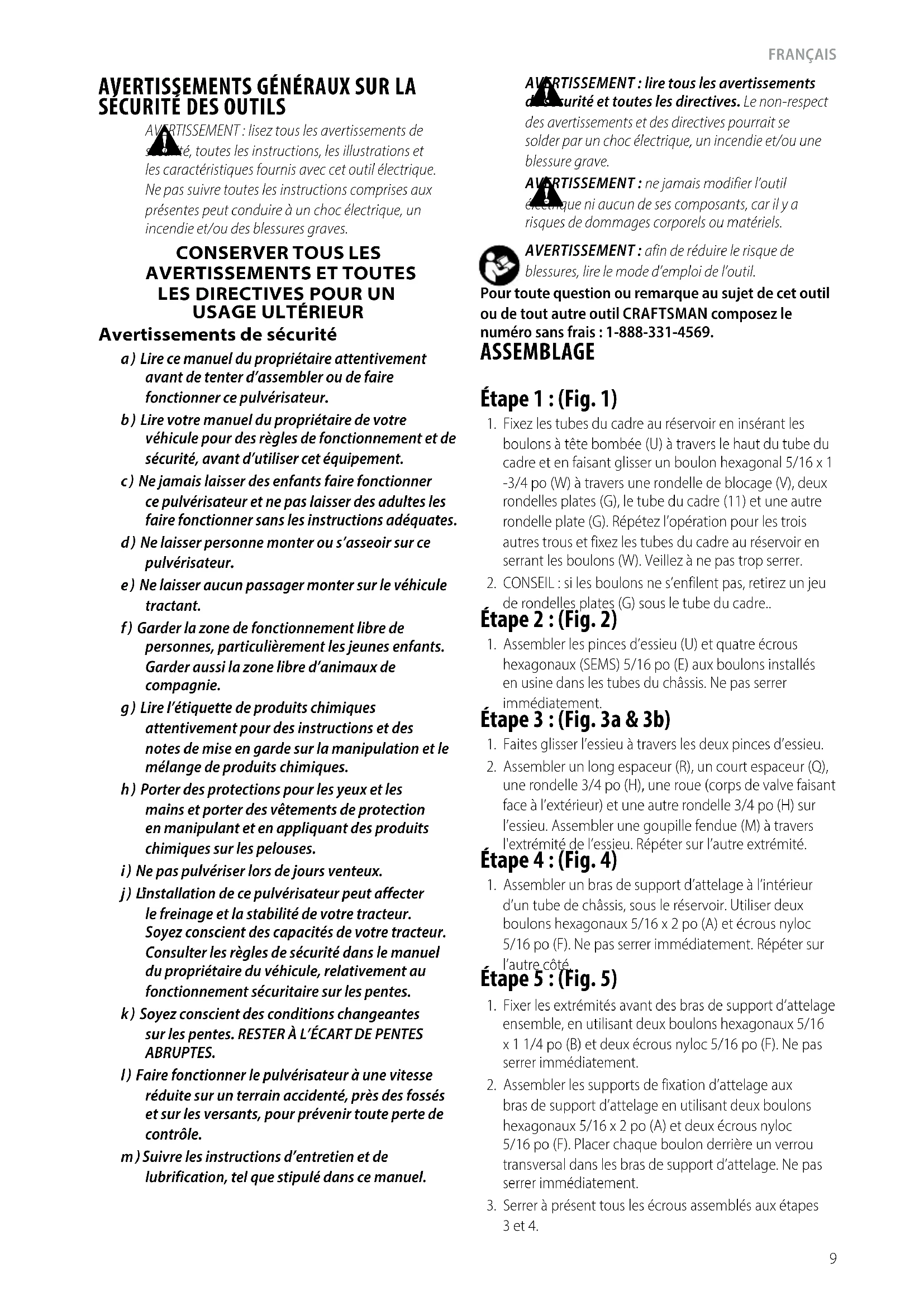 blessures, lire le mode d’emploi del’outil. Pour toute question ou remarque au sujet de cet outil ou de tout autre outil CRAFTSMAN composez le numéro sans frais : 1-888-331-4569. Étape 2 : (Fig. 2)