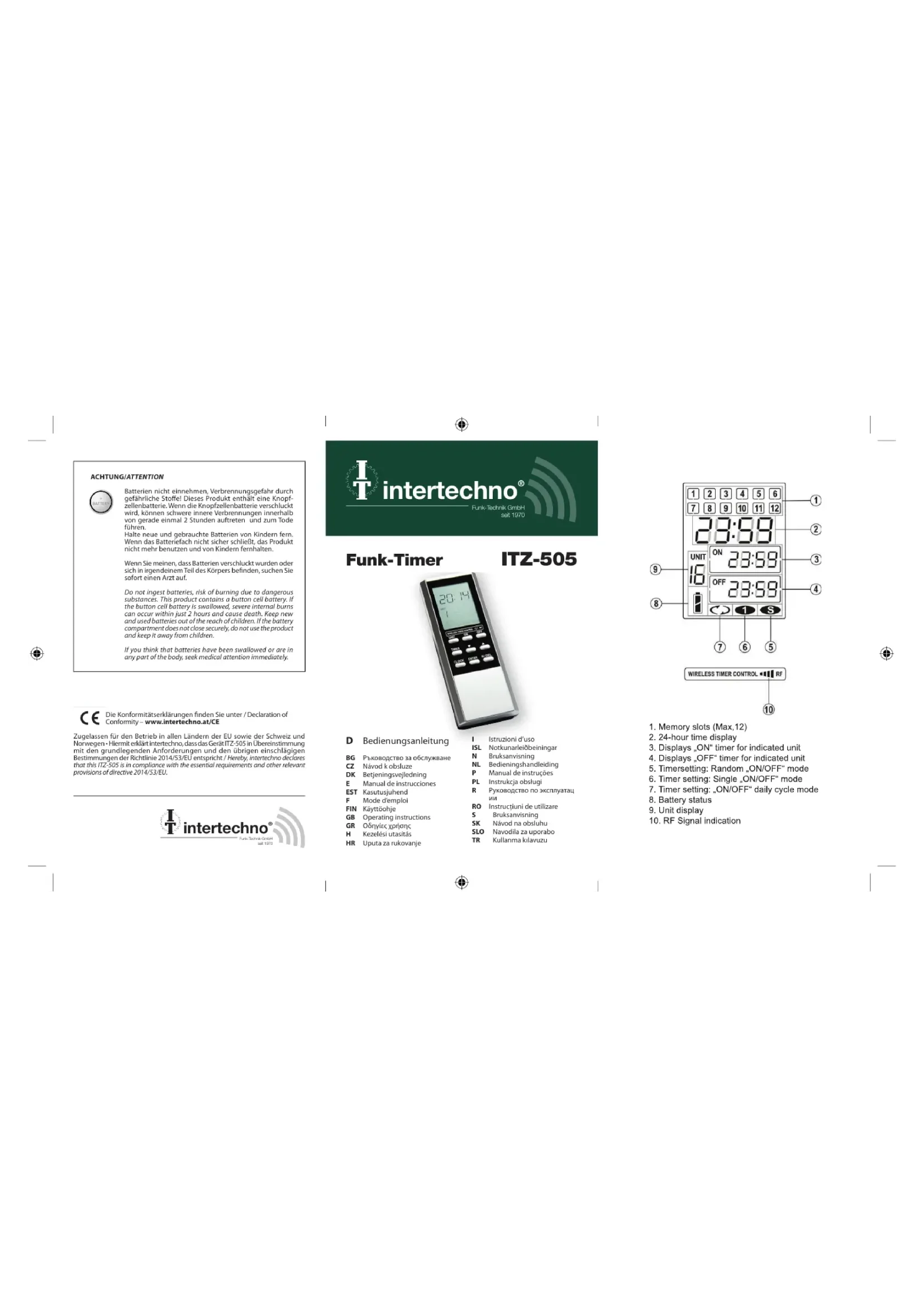 - Appuyez brièvement sur le bouton « TIMER » pour repasser en mode « prêt à fonctionner ». Sécurité enfant (pour empêcher toute modification accidentelle du paramétrage du minuteur) Activation : appuyez simultanément sur « ENTER » et sur « II / DEL » pendant 3 secondes. « CP » s’affiche brièvement. Désactivation : appuyez à nouveau simultanément sur les boutons « ENTER » et « II / DEL », pendant 3 secondes. Batterie Si la portée diminue ou que le symbole de batterie s’affiche à l’écran, il faut remplacer la batterie CR2032 de 3 V (fig. 3). La déclaration de conformité se trouve sur le site www.intertechno.at/CE Mode d’emploi