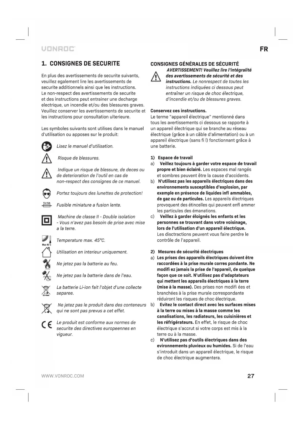 En plus des avertissements de securite suivants, veuillez egalement lire les avertissements de securite additionnels ainsi que les instructions. Le non-respect des avertissements de securite et des instructions peut entrainer une decharge electrique, un incendie et/ou des blessures graves. Veuillez conserver les avertissements de securite et les instructions pour consultation ulterieure. Les symboles suivants sont utilises dans le manuel d’utilisation ou apposes sur le produit: Lisez le manuel d’utilisation. Risque de blessures. Indique un risque de blessure, de deces ou de deterioration de l’outil en cas de non-respect des consignes de ce manuel. Portez toujours des lunettes de protection! Fusible miniature a fusion lente. Machine de classe II - Double isolation - Vous n’avez pas besoin de prise avec mise a la terre. Temperature max. 45°C. Utilisation en interieur uniquement. Ne jetez pas la batterie au feu. Ne jetez pas la batterie dans de l’eau. La batterie Li-ion fait l’objet d’une collecte separee. Ne jetez pas le produit dans des conteneurs qui ne sont pas prevus a cet effet. Le produit est conforme aux normes de securite des directives europeennes en vigueur. CONSIGNES GÉNÉRALES DE SÉCURITÉ AVERTISSEMENT! Veuillez lire l’intégralité des avertissements de sécurité et des instructions. Le non respect de toutes les instructions indiquées ci dessous peut entraîner un risque de choc électrique, d’incendie et/ou de blessures graves. Conservez ces instructions. Le terme “appareil électrique” mentionné dans tous les avertissements ci dessous se rapporte à un appareil électrique qui se branche au réseau électrique (grâce à un câble d’alimentation) ou à un appareil électrique (sans fi l) fonctionnant grâce à une batterie.
