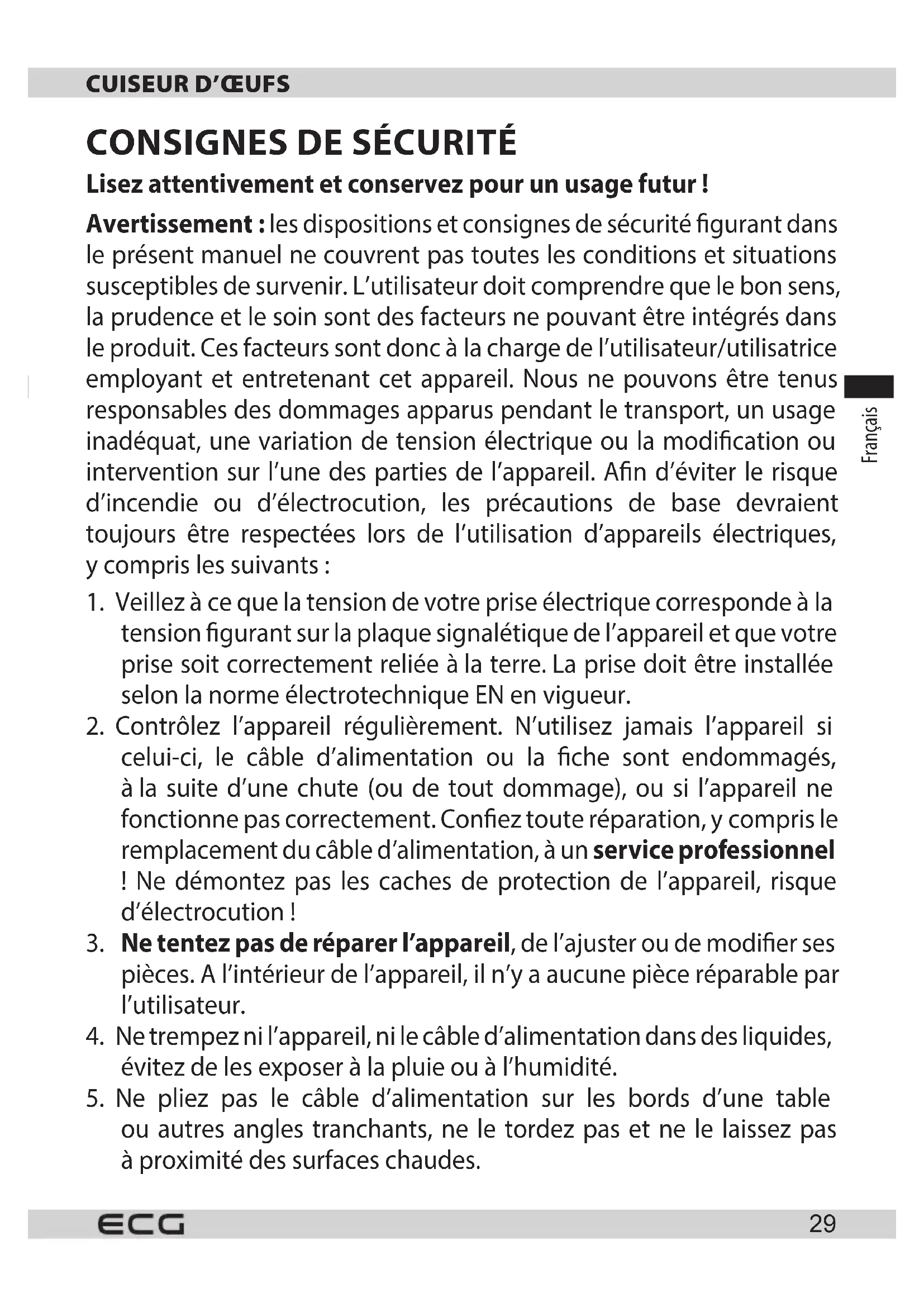 Papier d’emballage et carton ondulé – remettre dans les conteneurs de collecte de papiers. Film d’emballage, sacs PE, pièces en plastique – dans les conteneurs de collecte de plastique. ELIMINATION DU PRODUIT ALA FIN DE SA DUREE DE VIE Liquidation des équipements électriques et électroniques usagés (en vigueur dans les pays membres de l’Union européenne et les autres pays européens disposant d’un système de tri des déchets) Le symbole gurant sur le produit ou l’emballage signie que le produit ne doit pas être traité comme une ordure ménagère courante. Remettez le produit àun lieu de collecte prévu pour le recyclage des équipements électriques et électroniques. Une élimination correcte du produit évite des impacts négatifs sur la santé humaine et l’environnement. Le recyclage des matériaux contribue àla protection de l’environnement. Pour plus d’informations sur le recyclage de ce produit, adressez-vous àla mairie, aux centres de traitement des déchets ménagers ou au point de vente où vous avez acheté le produit. Ce produit est conforme aux directives européennes relatives àla compatibilité électromagnétique et àla sécurité électrique. Le mode d’emploi est disponible sur le site web www.ecg-electro.eu. Nous nous réservons le droit de modier le texte et les paramètres techniques. 08/05Hrvatski Bosanski Hrvatski Bosanski
