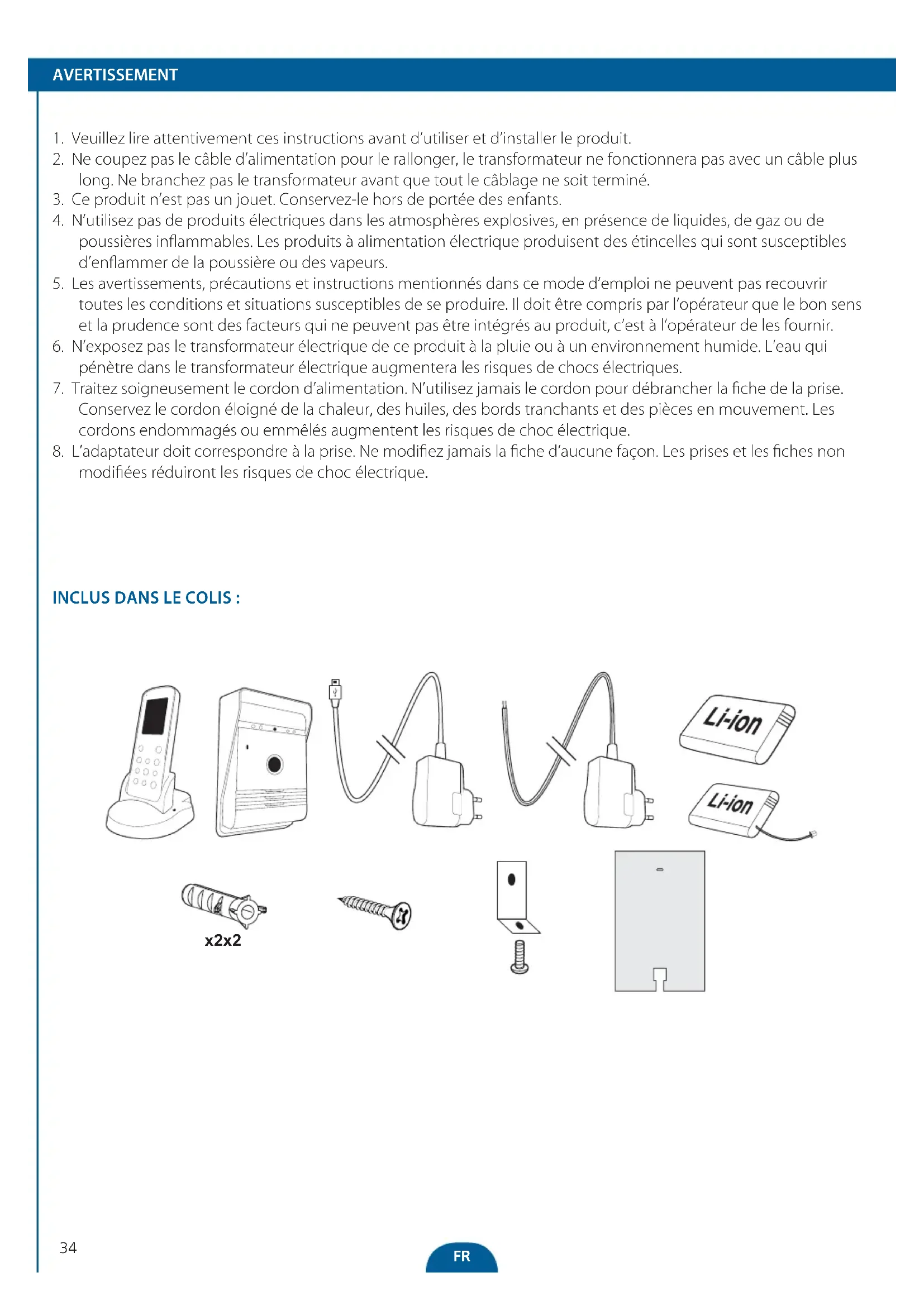 Seul un adulte doit remplacer et installer la batterie. Retirer les batteries épuisées de cet appareil. Ne pas jeter les batteries dans le feu car elles pourraient exploser ou présenter des fuites. Ne pas mettre en court-circuit les bornes des batteries. Ne pas mélanger des batteries épuisées avec des batteries neuves. Ne pas mélanger des batteries alcalines (carbone-zinc) avec des batteries rechargeables ou au lithium. Ne pas utiliser des batteries rechargeables avec cet appareil. Ne pas recharger des batteries non rechargeables. Ne pas mettre en contact direct cet appareil avec une source de chaleur ou une flamme. Ne pas permettre à de l’eau d’entrer en contact avec les batteries ou les fils. Installer avec soin pour éviter d’endommager les batteries. Lors de l’installation des batteries dans leurs logements, veuillez respecter la polarité (+)/(-). Utiliser uniquement les batteries recommandées. Retirer les batteries de l’appareil s’il est inutilisé pour une période prolongée. Tenir cet appareil hors de la portée des enfants en bas âge. Conserver les batteries inutilisées dans leur emballage d’origine En fin de vie, ce produit doit être retourné dans un centre de traitement des déchets afin d’extraire les batteries. FR4344 x2 x2 ADVERTENCIA