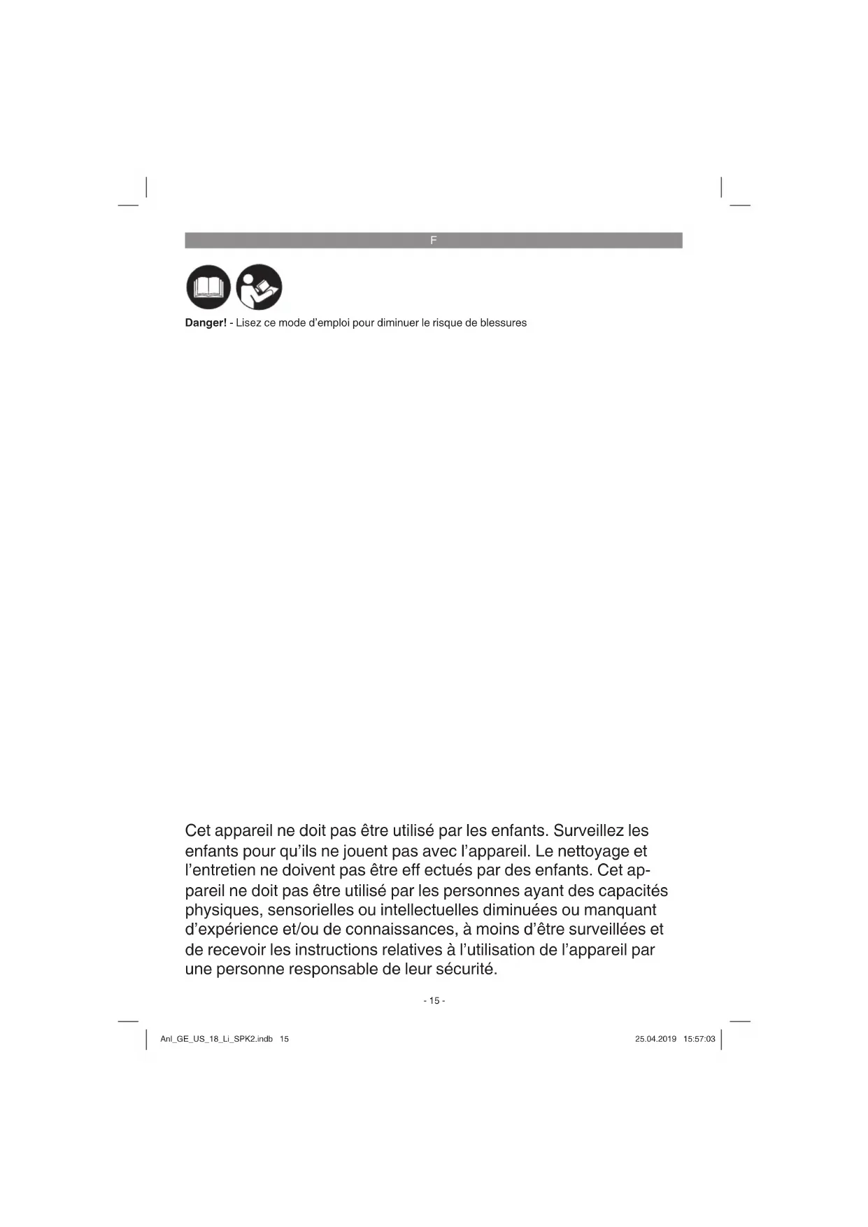 Danger! - Lisez ce mode d’emploi pour diminuer le risque de blessures Cet appareil ne doit pas être utilisé par les enfants. Surveillez les enfants pour qu’ils ne jouent pas avec l’appareil. Le nettoyage et l’entretien ne doivent pas être eff ectués par des enfants. Cet ap- pareil ne doit pas être utilisé par les personnes ayant des capacités physiques, sensorielles ou intellectuelles diminuées ou manquant d’expérience et/ou de connaissances, à moins d’être surveillées et de recevoir les instructions relatives à l’utilisation de l’appareil par une personne responsable de leur sécurité. Anl_GE_US_18_Li_SPK2.indb 15Anl_GE_US_18_Li_SPK2.indb 15 25.04.2019 15:57:0325.04.2019 15:57:03F