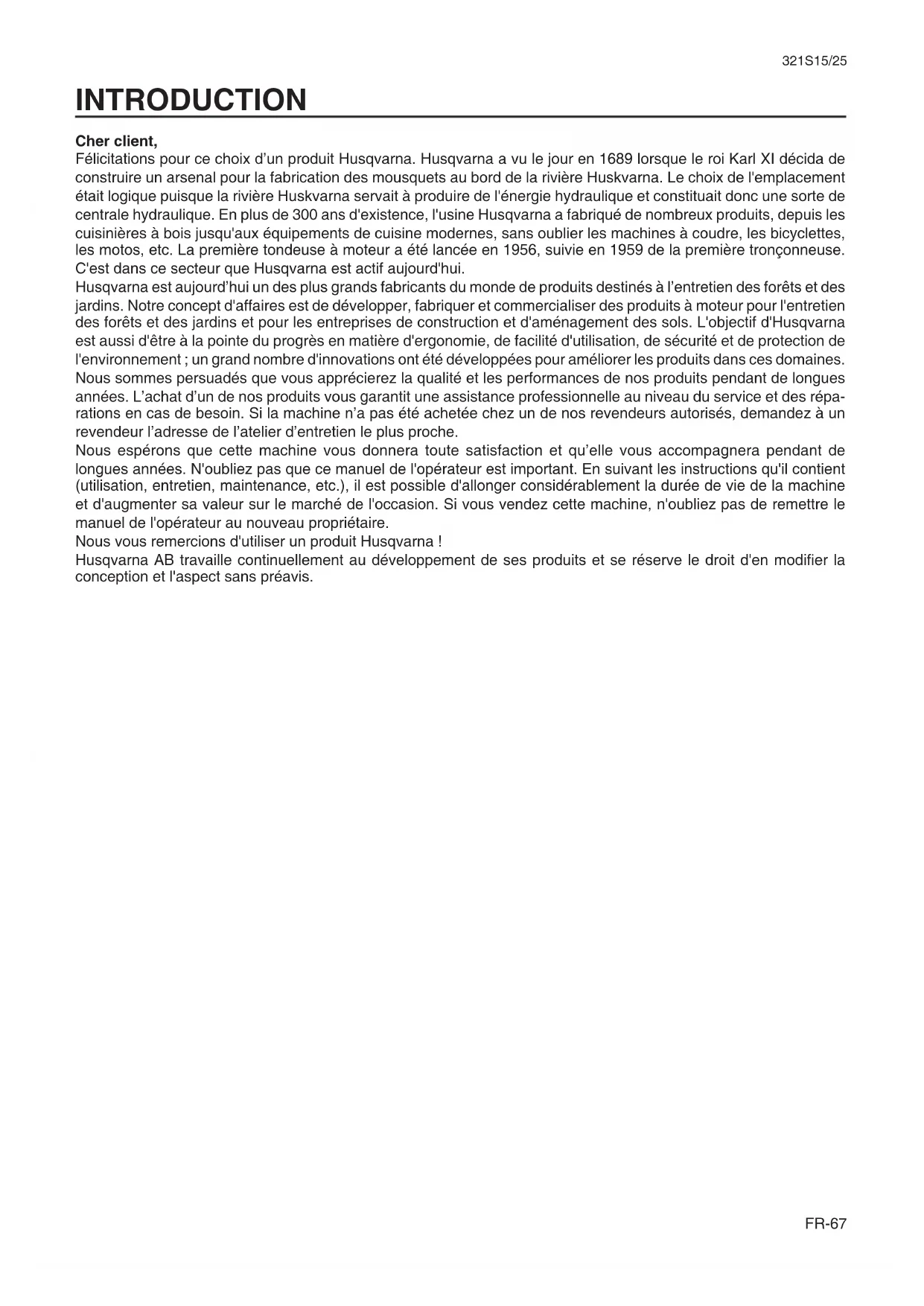 Disposal ........................................................ 18 Storage ......................................................... 18 TROUBLESHOOTING TECHNICAL DATA SOMMAIRE321S15/25 FR-67 Cher client, Félicitations pour ce choix d’un produit Husqvarna. Husqvarna a vu le jour en 1689 lorsque le roi Karl XI décida de construire un arsenal pour la fabrication des mousquets au bord de la rivière Huskvarna. Le choix de l'emplacement était logique puisque la rivière Huskvarna servait à produire de l'énergie hydraulique et constituait donc une sorte de centrale hydraulique. En plus de 300 ans d'existence, l'usine Husqvarna a fabriqué de nombreux produits, depuis les cuisinières à bois jusqu'aux équipements de cuisine modernes, sans oublier les machines à coudre, les bicyclettes, les motos, etc. La première tondeuse à moteur a été lancée en 1956, suivie en 1959 de la première tronçonneuse. C'est dans ce secteur que Husqvarna est actif aujourd'hui. Husqvarna est aujourd’hui un des plus grands fabricants du monde de produits destinés à l’entretien des forêts et des jardins. Notre concept d'affaires est de développer, fabriquer et commercialiser des produits à moteur pour l'entretien des forêts et des jardins et pour les entreprises de construction et d'aménagement des sols. L'objectif d'Husqvarna est aussi d'être à la pointe du progrès en matière d'ergonomie, de facilité d'utilisation, de sécurité et de protection de l'environnement ; un grand nombre d'innovations ont été développées pour améliorer les produits dans ces domaines. Nous sommes persuadés que vous apprécierez la qualité et les performances de nos produits pendant de longues années. L’achat d’un de nos produits vous garantit une assistance professionnelle au niveau du service et des répa- rations en cas de besoin. Si la machine n’a pas été achetée chez un de nos revendeurs autorisés, demandez à un revendeur l’adresse de l’atelier d’entretien le plus proche. Nous espérons que cette machine vous donnera toute satisfaction et qu’elle vous accompagnera pendant de longues années. N'oubliez pas que ce manuel de l'opérateur est important. En suivant les instructions qu'il contient (utilisation, entretien, maintenance, etc.), il est possible d'allonger considérablement la durée de vie de la machine et d'augmenter sa valeur sur le marché de l'occasion. Si vous vendez cette machine, n'oubliez pas de remettre le manuel de l'opérateur au nouveau propriétaire. Nous vous remercions d'utiliser un produit Husqvarna ! Husqvarna AB travaille continuellement au développement de ses produits et se réserve le droit d'en modifi er la conception et l'aspect sans préavis. INTRODUCTION321S15/25 FR-68