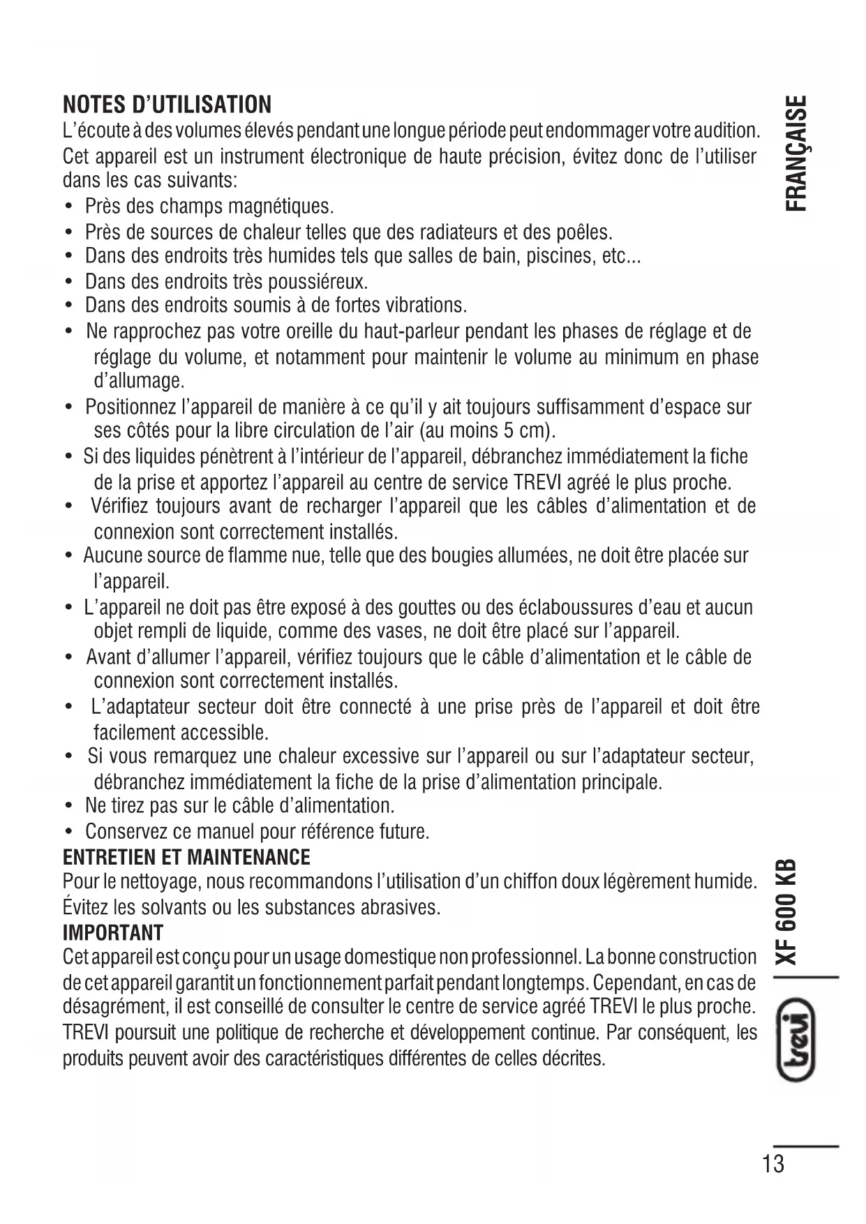 XF 600 KB - Haut-parleur Trevi - Notice d'utilisation et mode d'emploi gratuit