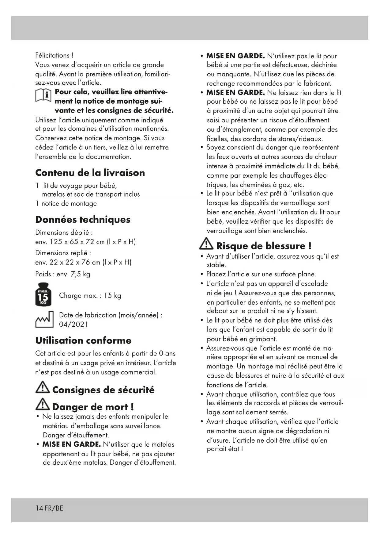 Charge max. : 15 kg Date de fabrication (mois/année) : 04/2021 Utilisation conforme Cet article est pour les enfants à partir de 0 ans et destiné à un usage privé en intérieur. L’article n’est pas destiné à un usage commercial. Consignes de sécurité Danger de mort !
