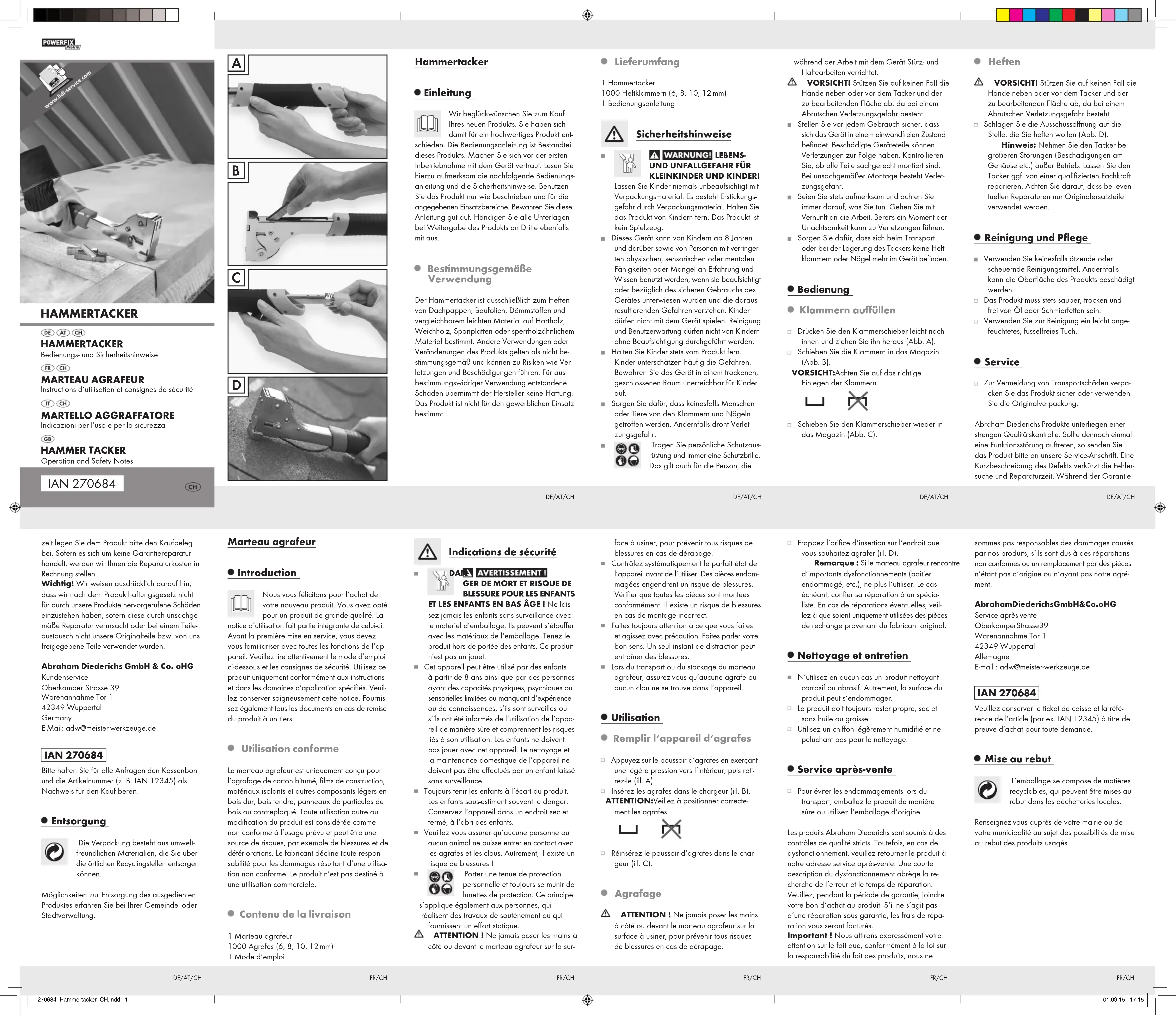 DE/AT/CH DE/AT/CH DE/AT/CH DE/AT/CH DE/AT/CH sommes pas responsables des dommages causés par nos produits, s‘ils sont dus à des réparations non conformes ou un remplacement par des pièces n‘étant pas d‘origine ou n‘ayant pas notre agré- ment. Abraham Diederichs GmbH & Co. oHG Service après-vente Oberkamper Strasse 39 Warenannahme Tor 1 42349 Wuppertal Allemagne E-mail : adw@meister-werkzeuge.de IAN 270684 Veuillez conserver le ticket de caisse et la réfé- rence de l’article (par ex. IAN 12345) à titre de preuve d’achat pour toute demande. Mise au rebut L’emballage se compose de matières recyclables, qui peuvent être mises au rebut dans les déchetteries locales. Renseignez-vous auprès de votre mairie ou de votre municipalité au sujet des possibilités de mise au rebut des produits usagés. Frappez l‘orifice d‘insertion sur l‘endroit que vous souhaitez agrafer (ill. D). Remarque : Si le marteau agrafeur rencontre d‘importants dysfonctionnements (boîtier endommagé, etc.), ne plus l‘utiliser. Le cas échéant, confier sa réparation à un spécia- liste. En cas de réparations éventuelles, veil- lez à que soient uniquement utilisées des pièces de rechange provenant du fabricant original. Nettoyage et entretien N’utilisez en aucun cas un produit nettoyant corrosif ou abrasif. Autrement, la surface du produit peut s‘endommager. Le produit doit toujours rester propre, sec et sans huile ou graisse. Utilisez un chiffon légèrement humidifié et ne peluchant pas pour le nettoyage. Service après-vente Pour éviter les endommagements lors du transport, emballez le produit de manière sûre ou utilisez l‘emballage d‘origine. Les produits Abraham Diederichs sont soumis à des contrôles de qualité stricts. Toutefois, en cas de dysfonctionnement, veuillez retourner le produit à notre adresse service après-vente. Une courte description du dysfonctionnement abrège la re- cherche de l‘erreur et le temps de réparation. Veuillez, pendant la période de garantie, joindre votre bon d‘achat au produit. S‘il ne s‘agit pas d‘une réparation sous garantie, les frais de répa- ration vous seront facturés. Important ! Nous attirons expressément votre attention sur le fait que, conformément à la loi sur la responsabilité du fait des produits, nous ne face à usiner, pour prévenir tous risques de blessures en cas de dérapage. Contrôlez systématiquement le parfait état de l‘appareil avant de l‘utiliser. Des pièces endom- magées engendrent un risque de blessures. Vérifier que toutes les pièces sont montées conformément. Il existe un risque de blessures en cas de montage incorrect. Faites toujours attention à ce que vous faites et agissez avec précaution. Faites parler votre bon sens. Un seul instant de distraction peut entraîner des blessures. Lors du transport ou du stockage du marteau agrafeur, assurez-vous qu‘aucune agrafe ou aucun clou ne se trouve dans l‘appareil. Utilisation Remplir l‘appareil d‘agrafes Appuyez sur le poussoir d‘agrafes en exerçant une légère pression vers l‘intérieur, puis reti- rez-le (ill. A). Insérez les agrafes dans le chargeur (ill. B). ATTENTION : Veillez à positionner correcte- ment les agrafes.