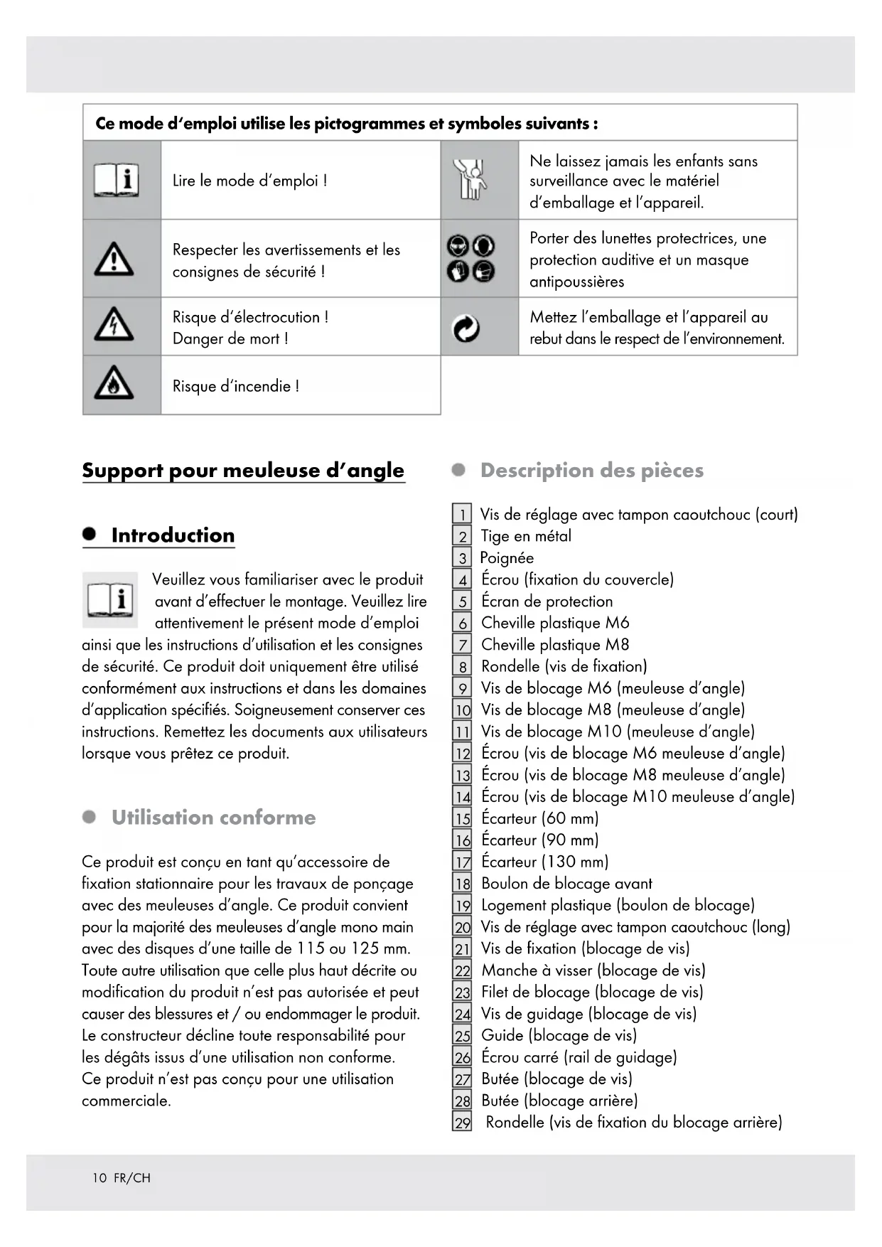 so ein, dass sich das Werkstück in der Mitte der Trennscheibe befindet. Schalten Sie nun den Winkelschleifer ein und drücken Sie ihn auf das Werkstück. Vermeiden Sie ruckartige Bewegungen und üben Sie gleichmäßigen Druck auf das Werkstück aus. Reinigung und Pflege Verwenden Sie zur Reinigung und Pflege nur ein leicht angefeuchtetes fusselfreies Tuch. Entsorgung Die Verpackung besteht aus umweltfreundlichen Materialien, die Sie über die örtlichen Recyclingstellen entsorgen können. Möglichkeiten zur Entsorgung des ausgedienten Produktes erfahren Sie bei Ihrer Gemeinde- oder Stadtverwaltung.9 FR/CH Introduction Utilisation conforme ............................................................................................................................. Page 10 Description des pièces ........................................................................................................................ Page 10 Fourniture .............................................................................................................................................. Pag e 11 Caractéristiques ................................................................................................................................... Pag e 11 Consignes de sécurité Consignes de sécurité générales ....................................................................................................... Pa g e 11 Montage ........................................................................................................................................... Page 13 Utilisation ........................................................................................................................................ Page 14 Nettoyage et entretien ........................................................................................................ Page 14 Mise au rebut ............................................................................................................................... Page 1410 FR/CH Support pour meuleuse d’angle Introduction Veuillez vous familiariser avec le produit avant d’effectuer le montage. Veuillez lire attentivement le présent mode d’emploi ainsi que les instructions d’utilisation et les consignes de sécurité. Ce produit doit uniquement être utilisé conformément aux instructions et dans les domaines d’application spécifiés. Soigneusement conserver ces instructions. Remettez les documents aux utilisateurs lorsque vous prêtez ce produit. Utilisation conforme Ce produit est conçu en tant qu’accessoire de fixation stationnaire pour les travaux de ponçage avec des meuleuses d’angle. Ce produit convient pour la majorité des meuleuses d’angle mono main avec des disques d’une taille de 115 ou 125 mm. Toute autre utilisation que celle plus haut décrite ou modification du produit n’est pas autorisée et peut causer des blessures et / ou endommager le produit. Le constructeur décline toute responsabilité pour les dégâts issus d’une utilisation non conforme. Ce produit n’est pas conçu pour une utilisation commerciale. Description des pièces