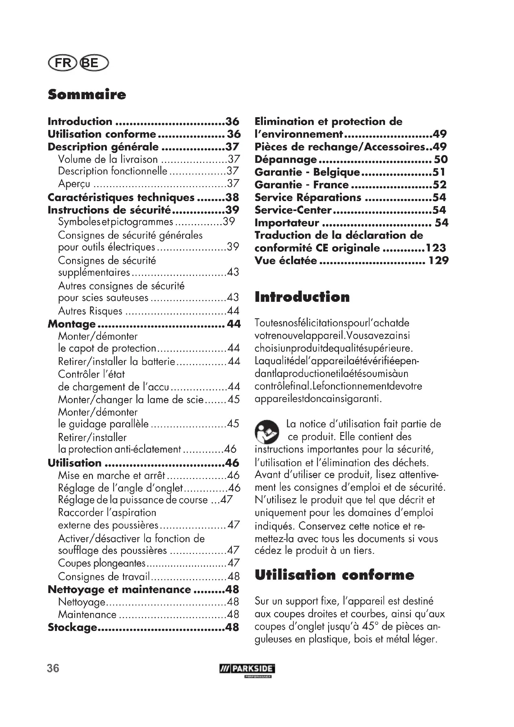 - Utilisation conforme p. 36