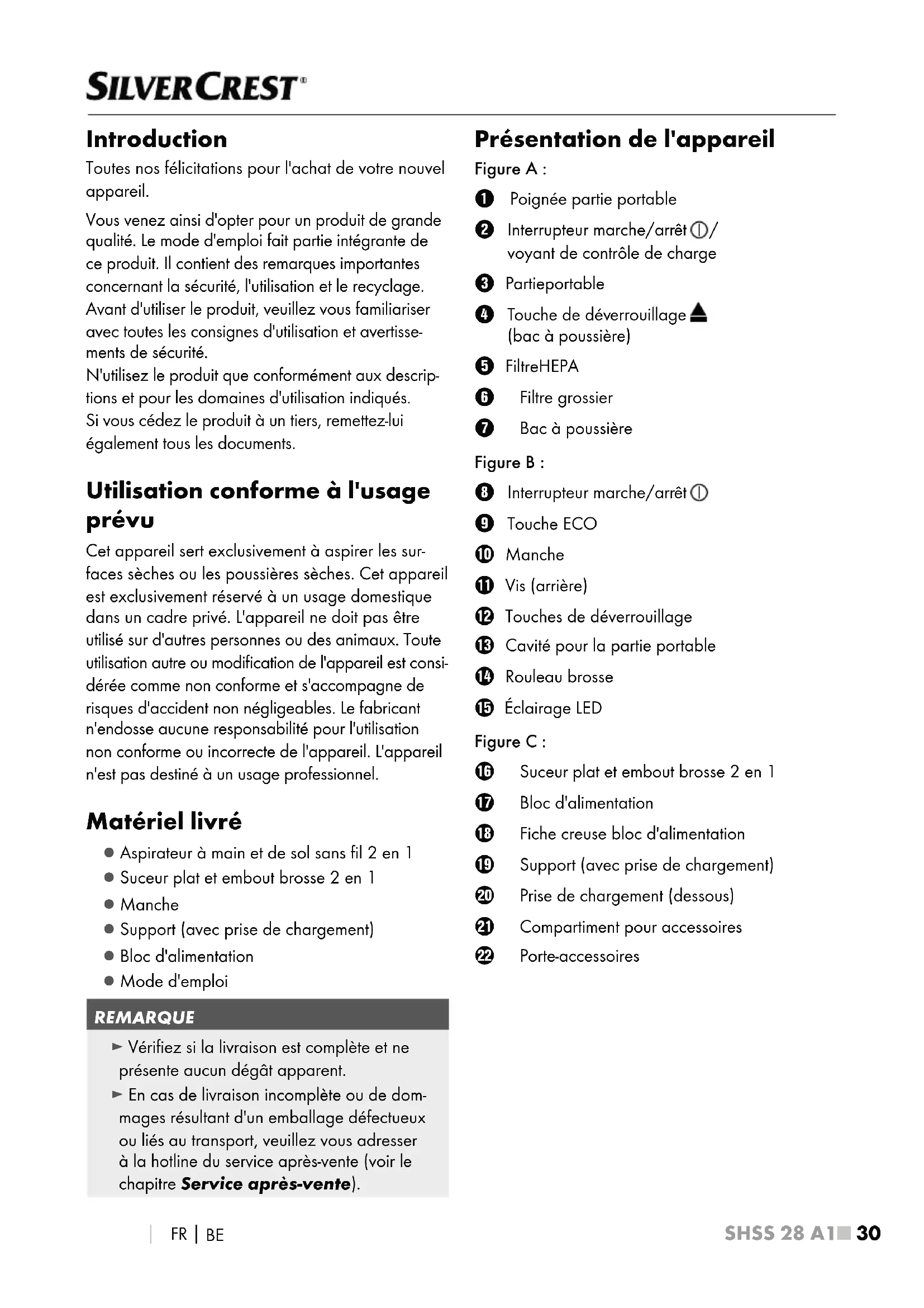 Introduction Toutes nos félicitations pour l'achat de votre nouvel appareil. Vous venez ainsi d'opter pour un produit de grande qualité. Le mode d'emploi fait partie intégrante de ce produit. Il contient des remarques importantes concernant la sécurité, l'utilisation et le recyclage. Avant d'utiliser le produit, veuillez vous familiariser avec toutes les consignes d'utilisation et avertisse- ments de sécurité. N'utilisez le produit que conformément aux descrip- tions et pour les domaines d'utilisation indiqués. Si vous cédez le produit à un tiers, remettez-lui également tous les documents. Utilisation conforme à l'usage prévu Cet appareil sert exclusivement à aspirer les sur- faces sèches ou les poussières sèches. Cet appareil est exclusivement réservé à un usage domestique dans un cadre privé. L'appareil ne doit pas être utilisé sur d'autres personnes ou des animaux. Toute utilisation autre ou modification de l'appareil est consi- dérée comme non conforme et s'accompagne de risques d'accident non négligeables. Le fabricant n'endosse aucune responsabilité pour l'utilisation non conforme ou incorrecte de l'appareil. L'appareil n'est pas destiné à un usage professionnel. Matériel livré ▯ Aspirateur à main et de sol sans fil 2 en 1 ▯ Suceur plat et embout brosse 2 en 1 ▯ Manche ▯ Support (avec prise de chargement) ▯ Bloc d'alimentation ▯ Mode d'emploi REMARQUE ► Vérifiez si la livraison est complète et ne présente aucun dégât apparent. ► En cas de livraison incomplète ou de dom- mages résultant d'un emballage défectueux ou liés au transport, veuillez vous adresser à la hotline du service après-vente (voir le chapitre Service après-vente). Présentation de l'appareil Figure A: 1 Poignée partie portable 2 Interrupteur marche/arrêt / voyant de contrôle de charge 3 Partie portable 4 Touche de déverrouillage (bac à poussière) 5 Filtre HEPA 6 Filtre grossier 7 Bac à poussière Figure B: 8 Interrupteur marche/arrêt