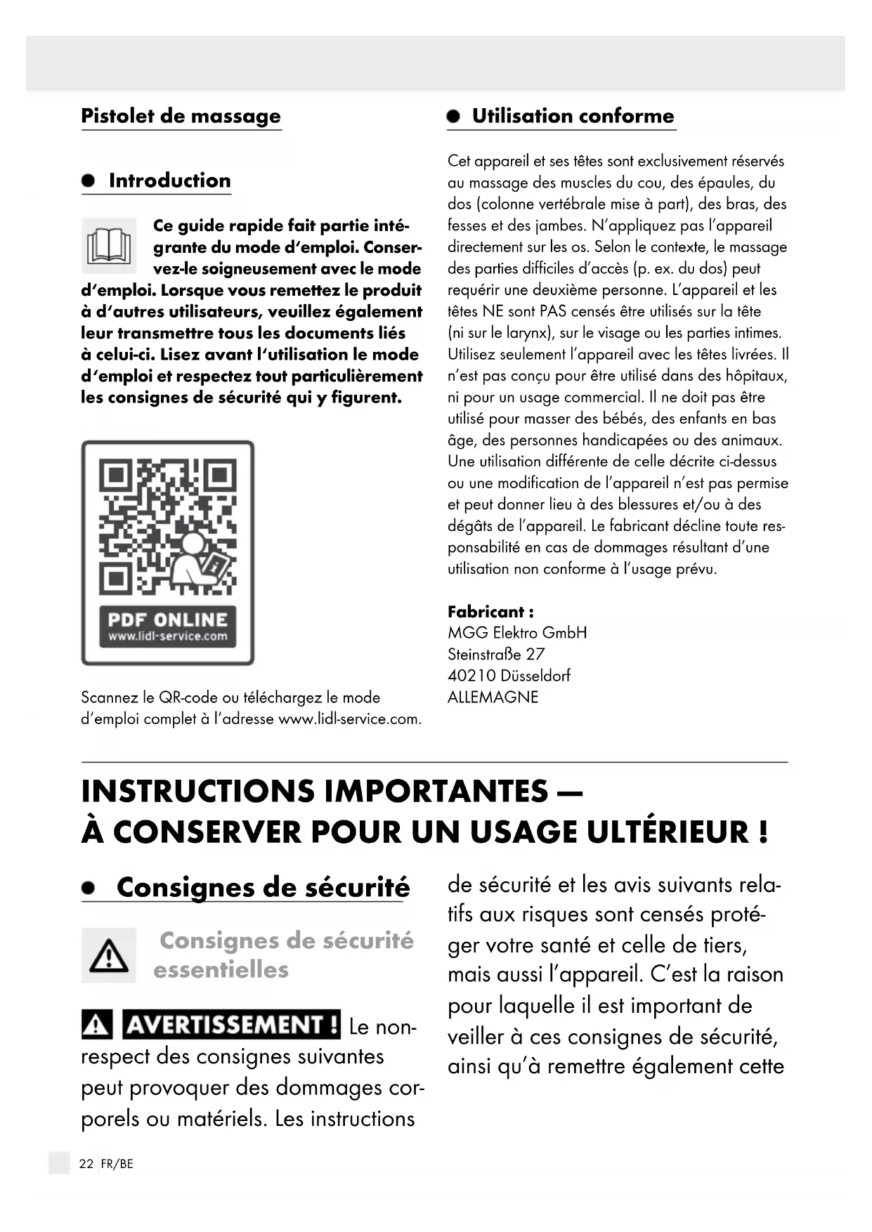 ‘emploi et respectez tout particulièrem ent les consignes de sécurité qui y figurent. Scannez le QR-code ou téléchargez le mode d‘emploi complet à l‘adresse www.lidl-service.com. Utilisation conforme Cet appareil et ses têtes sont exclusivement réservés au massage des muscles du cou, des épaules, du dos (colonne vertébrale mise à part), des bras, des fesses et des jambes. N’appliquez pas l’appareil directement sur les os. Selon le contexte, le massage des parties difficiles d’accès (p.ex.du dos) peut requérir une deuxième personne. L’appareil et les têtes NE sont PAS censés être utilisés sur la tête (ni sur le larynx), sur le visage ou les parties intimes. Utilisez seulement l’appareil avec les têtes livrées. Il n’est pas conçu pour être utilisé dans des hôpitaux, ni pour un usage commercial. Il ne doit pas être utilisé pour masser des bébés, des enfants en bas âge, des personnes handicapées ou des animaux. Une utilisation différente de celle décrite ci-dessus ou une modification de l’appareil n’est pas permise et peut donner lieu à des blessures et/ou à des dégâts de l’appareil. Le fabricant décline toute res- ponsabilité en cas de dommages résultant d’une utilisation non conforme à l’usage prévu. Fabricant : MGG Elektro GmbH Steinstraße 27 40210 Düsseldorf ALLEMAGNE INSTRUCTIONS IMPORTANTES — À CONSERVER POUR UN USAGE ULTÉRIEUR ! Consignes de sécurité Consignes de sécurité essentielles Le non- respect des consignes suivantes peut provoquer des dommages cor- porels ou matériels. Les instructions de sécurité et les avis suivants rela- tifs aux risques sont censés proté- ger votre santé et celle de tiers, mais aussi l’appareil. C’est la raison pour laquelle il est important de veiller à ces consignes de sécurité, ainsi qu’à remettre également cette23 FR/BE notice de montage si l’appareil est remis à une autre personne. N’utilisez pas l’appareil - sur des animaux; - en cas d’altérations patholo- giques ou de blessures affectant les régions à masser (p.ex. en cas d’hernie discale, de bles- sures ouvertes); - à proximité du cœur si vous portez un stimula- teur cardiaque. Le cas échéant, adressez-vous à votre médecin avant de l’utiliser sur d’autres zones du corps, - sur des parties du corps et de la peau enflées, brûlées, irritées ou blessées; - en cas de plaies lacérées, de capillaires, de varices, d’acné, de couperose, d’herpès ou d’autres maladies de la peau; - durant la grossesse; - sur la tête (ni sur le larynx), sur le visage ou sur les parties intimes; - durant votre sommeil; - après avoir pris des médicaments ou consommé de l’alcool (perception réduite !) ; - en voiture; - directement sur les os, notam- ment sur la colonne vertébrale, sur le cou-de-pied ou d’autres endroits du corps semblables. Adressez-vous à votre médecin avant d’utiliser l’appareil, surtout - si vous souffrez d’une maladie grave; - si vous portez un stimulateur cardiaque, des implants ou d’autres appareils; - en cas de thromboses; - en cas de diabète; - en cas de douleurs inexpliquées. Cet appareil est uniquement conçu pour un usage privé et n‘est pas destiné à un usage professionnel. Cet appareil peut être utilisé par des enfants à partir de 8 ans ainsi que par des personnes ayant des capacités physiques, psychiques ou sensorielles limi- tées ou manquant d’expérience ou de connaissances, s’ils sont surveillés ou s’ils ont été infor- més de l’utilisation de l’appareil de manière sûre et comprennent les risques liés à son utilisation. Les enfants ne doivent pas jouer avec l’appareil. Ils risqueraient de se blesser. Le nettoyage et l’entretien ne doivent pas être effectués par des enfants laissés sans surveil-24 FR/BE lance. Ils risqueraient de se blesser. Ne laissez jamais les têtes à portée des enfants. Risque d’asphyxie ! N’utilisez jamais l’appareil - sans surveillance, surtout si des enfants sont à proximité; - sous un revêtement, p.ex. sous une couette, des coussins, etc.; - à proximité de l’essence ou d’autres substances facilement inflammables; - dans des endroits qui ne sont ni secs ni situés en intérieur (p.ex. jamais dans la baignoire ou au sauna). N’utilisez jamais l’appareil à proximité de baignoires, de la- vabos, de douches ou d’autres cuves remplies d’eau ou d’autres liquides. Il existe un risque d’électrocution! Ne tentez jamais de saisir l’ap- pareil s’il est tombé dans l’eau. Avant de l’utiliser, assurez-vous que l’appareil et ses têtes ne présentent aucun défaut visible. En cas de doute, n’utilisez pas le produit et adressez-vous à votre revendeur ou au service client indiqué. Tenez le produit à l’écart des objets pointus ou tranchants. Si l’appareil est tombé à terre ou que d’autres dommages sont constatés sur l’appareil, celui-ci ne doit plus être utilisé. Éteignez l’appareil après chaque utilisation et avant chaque net- toyage. N’utilisez pas l’appareil plus de 10minutes (risque de surchauffe). Laissez l’appareil refroidir au moins 15minutes avant de l’utiliser de nouveau. N’insérez pas dans l’ouverture de l’appareil d’autres objets que les têtes fournies. Veillez à ce que les pièces mobiles soient toujours mobiles. Ne pincez pas et ne coincez pas de partie de votre corps, notamment vos doigts, entre les éléments du masseur ou leurs fixations. N’utilisez l’appareil qu’avec les accessoires livrés (têtes et adap- tateur secteur). Protégez l’appareil et les têtes contre les chocs, l’humidité, la poussière, les produits chimiques, les fortes variations de tempéra- ture et la proximité directe de sources de chaleur (four, radia- teur). N’essayez en aucun de réparer vous-même l’appareil!25 FR/BE Les appareils électroniques doivent uniquement être réparés par des techniciens. Vous ne dev