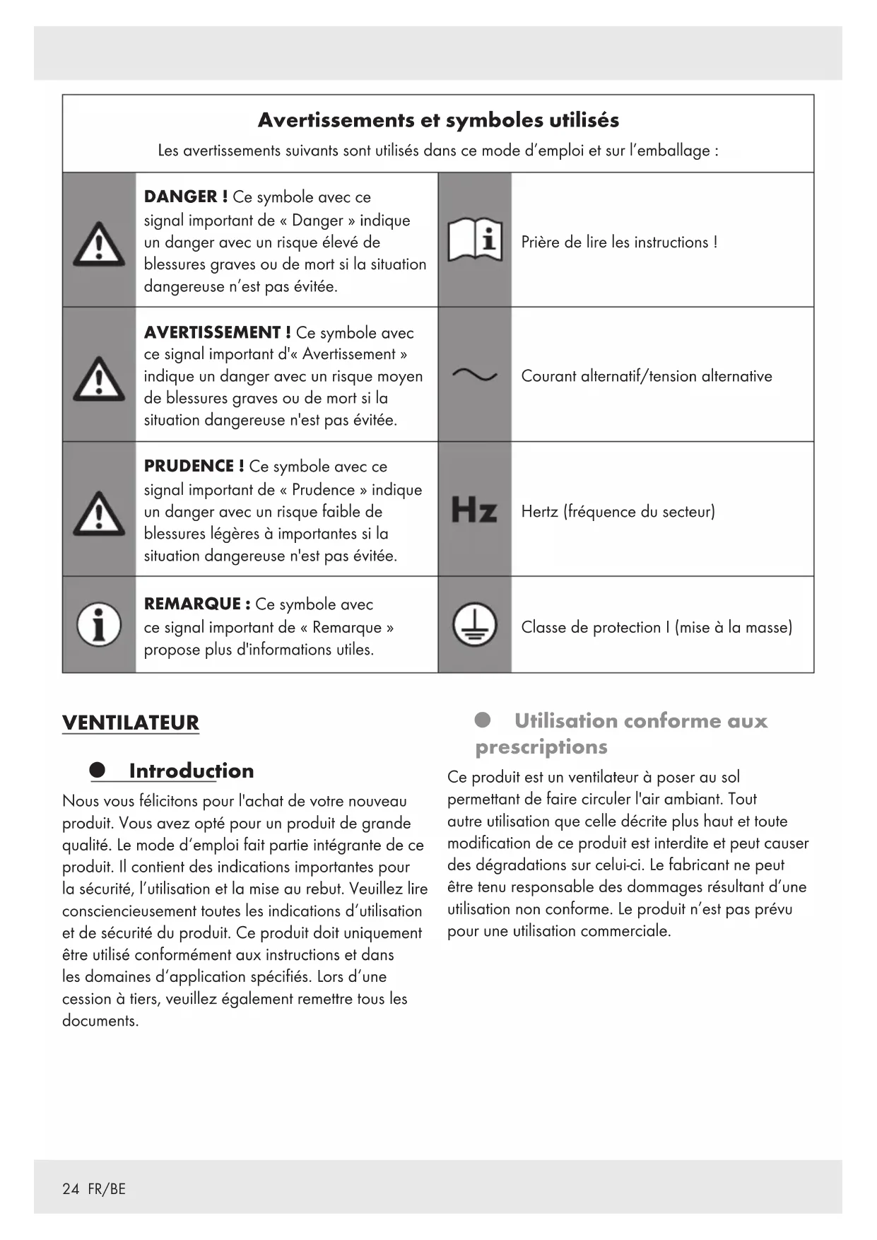 - s‘il présente les qualités qu‘un acheteur peut légitimement attendre eu égard aux déclarations publiques faites par le vendeur, par le producteur ou par son représentant, notamment dans la publicité ou l‘étiquetage ;31 FR/BE 2° Ou s‘il présente les caractéristiques définies d‘un commun accord par les parties ou être propre à tout usage spécial recherché par l‘acheteur, porté à la connaissance du vendeur et que ce dernier a accepté. Article L217-12 du Code de la consommation L‘action résultant du défaut de conformité se prescrit par deux ans à compter de la délivrance du bien. Article 1641 du Code civil Le vendeur est tenu de la garantie à raison des défauts cachés de la chose vendue qui la rendent impropre à l‘usage auquel on la destine, ou qui diminuent tellement cet usage que l‘acheteur ne l‘aurait pas acquise, ou n‘en aurait donné qu‘un moindre prix, s‘il les avait connus. Article 1648 1er alinéa du Code civil L‘action résultant des vices rédhibitoires doit être intentée par l‘acquéreur dans un délai de deux ans à compter de la découverte du vice. Les pièces détachées indispensables à l’utilisation du produit sont disponibles pendant la durée de la garantie du produit. Le produit a été fabriqué selon des critères de qualité stricts et contrôlé consciencieusement avant sa livraison. En cas de défaillance, vous êtes en droit de retourner ce produit au vendeur. La présente garantie ne constitue pas une restriction de vos droits légaux. Ce produit bénéficie d‘une garantie de 3 ans à compter de sa date d’achat. La durée de garantie débute à la date d’achat. Veuillez conserver le ticket de caisse original. Il fera office de preuve d’achat. Si un problème matériel ou de fabrication devait survenir dans 3 ans suivant la date d‘achat de ce produit, nous assurons à notre discrétion la réparation ou le remplacement du produit sans frais supplémentaires. La garantie prend fin si le produit est endommagé suite à une utilisation inappropriée ou à un entretien défaillant. La garantie couvre les vices matériels et de fabrication. Cette garantie ne s’étend ni aux pièces du produit soumises à une usure normale (p. ex. des piles) et qui, par conséquent, peuvent être considérées comme des pièces d’usure, ni aux dommages sur des composants fragiles, comme des interrupteurs, des batteries ou des éléments fabriqués en verre. Faire valoir sa garantie Pour garantir la rapidité d’exécution de la procédure de garantie, veuillez respecter les indications suivantes : Veuillez conserver le ticket de caisse et la référence du produit (par ex. IAN 123456_7890) à titre de preuve d’achat pour toute demande. Le numéro de référence de l’article est indiqué sur la plaque d’identification, gravé sur la page de titre de votre manuel (en bas à gauche) ou sur un autocollant apposé sur la face arrière ou inférieure du produit. En cas de dysfonctionnement du produit, ou de tout autre défaut, contactez en premier lieu le service après-vente par téléphone ou par e-mail aux coordonnées indiquées ci-dessous. Vous pouvez alors envoyer franco de port tout produit considéré comme défectueux au service clientèle indiqué, accompagné de la preuve d’achat (ticket de caisse) et d’une description écrite du défaut avec mention de sa date d’apparition. Service après-vente Service après-vente France Tél.: 0800904879 E-Mail: owim@lidl.fr Service après-vente Belgique Tél.: 080071011 Tél.: 80023970 (Luxembourg) E-Mail: owim@lidl.be32 NL/BE Gebruikte waarschuwingen en symbolen .................................... Pagina 33 Inleiding .................................................................... Pagina 33 Beoogd gebruik ............................................................. Pagina 33 Leveringsomvang ............................................................ Pagina 34 Onderdelenbeschrijving....................................................... Pagina 34 Technische gegevens ......................................................... Pagina 34 Veiligheidstips............................................................... Pagina 34 Voor het eerste gebruik...................................................... Pagina 38 Uitpakken.................................................................. Pagina 38 Hellingshoek instellen......................................................... Pagina 38 Bediening ................................................................... Pagina 38 Product in-/uitschakelen, ventilatorsnelheid instellen ................................. Pagina 38 Schoonmaken en onderhoud................................................. Pagina 38 Opbergen ................................................................... Pagina 38 Afvoer ...................................................................... Pagina 39 Garantie .................................................................... Pagina 3933 NL/BE Gebruikte waarschuwingen en symbolen In deze gebruiksaanwijzing en op de verpakking worden de volgende waarschuwingen gebruikt: GEVAAR! Dit symbool met de aanduiding “Gevaar” duidt op een groot risico op gevaar dat, indien niet vermeden, zware verwondingen of de dood tot gevolg kan hebben. Lees de tips door! WAARSCHUWING! Dit symbool met de aanduiding “Waarschuwing” betekent een middelmatig risico op gevaar dat, indien niet vermeden, zware verwondingen of de dood tot gevolg kan hebben. Wisselstroom/-spanning VOORZICHTIG! Dit symbool met de aanduiding “Voorzichtig” duidt op een klein risico op gevaar dat, indien niet vermeden, kan leiden tot kleine of middelgrote verwondingen. Hertz (netfrequentie) TIP: Dit symbool met de aanduiding “Tip” duidt op verdere nuttige informatie. Veiligheidsklasse I (Veiligheidsaarding) VLOERVENTILATOR Inleiding Hartelijk gefeliciteerd met de aankoop van uw nieuwe product. U heeft voor een hoogwaardi