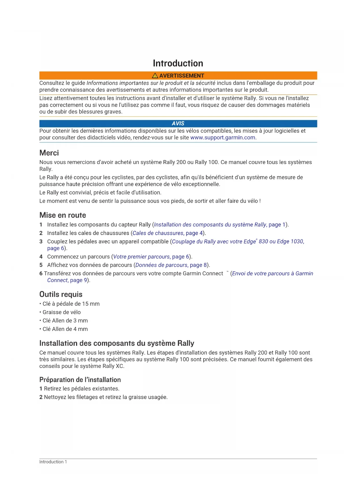 - Index Table des matières iIntroduction AVERTISSEMENT Consultez le guide Informations importantes sur le produit et la sécurité inclus dans l'emballage du produit pour prendre connaissance des avertissements et autres informations importantes sur le produit. Lisez attentivement toutes les instructions avant d'installer et d'utiliser le système Rally. Si vous ne l'installez pas correctement ou si vous ne l'utilisez pas comme il faut, vous risquez de causer des dommages matériels ou de subir des blessures graves. AVIS Pour obtenir les dernières informations disponibles sur les vélos compatibles, les mises à jour logicielles et pour consulter des didacticiels vidéo, rendez-vous sur le site www.support.garmin.com. Merci Nous vous remercions d'avoir acheté un système Rally 200 ou Rally 100. Ce manuel couvre tous les systèmes Rally. Le Rally a été conçu pour les cyclistes, par des cyclistes, afin qu'ils bénéficient d'un système de mesure de puissance haute précision offrant une expérience de vélo exceptionnelle. Le Rally est convivial, précis et facile d'utilisation. Le moment est venu de sentir la puissance sous vos pieds, de sortir et aller faire du vélo ! Mise en route 1 Installez les composants du capteur Rally (Installation des composants du système Rally, page 1). 2 Installez les cales de chaussures (Cales de chaussures, page 4). 3 Couplez les pédales avec un appareil compatible (Couplage du Rally avec votre Edge p. 22