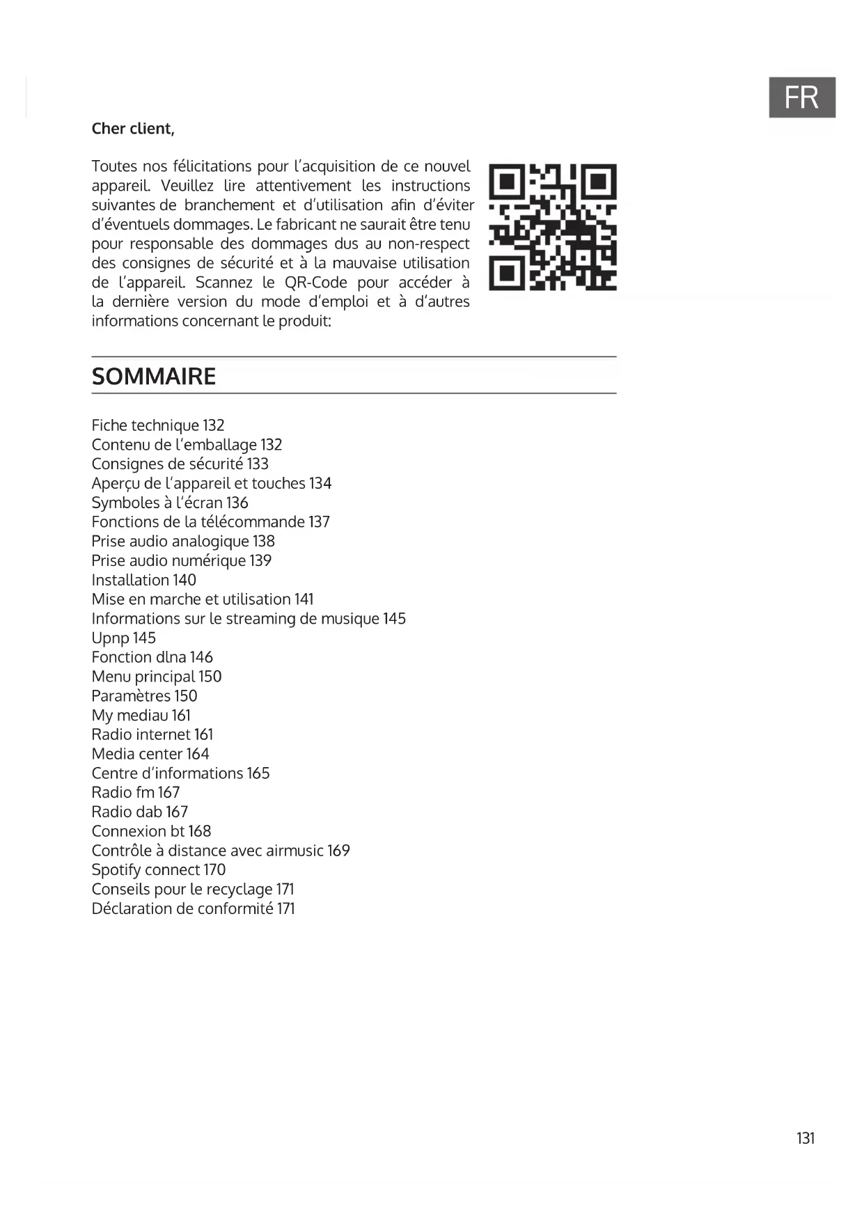 Cher client, Toutes nos félicitations pour l’acquisition de ce nouvel appareil. Veuillez lire attentivement les instructions suivantes de branchement et d’utilisation an d’éviter d’éventuels dommages. Le fabricant ne saurait être tenu pour responsable des dommages dus au non-respect des consignes de sécurité et à la mauvaise utilisation de l’appareil. Scannez le QR-Code pour accéder à la dernière version du mode d‘emploi et à d‘autres informations concernant le produit: SOMMAIRE Fiche technique 132 Contenu de l‘emballage 132 Consignes de sécurité 133 Aperçu de l‘appareil et touches 134 Symboles à l‘écran 136 Fonctions de la télécommande 137 Prise audio analogique 138 Prise audio numérique 139 Installation 140 Mise en marche et utilisation 141 Informations sur le streaming de musique 145 Upnp 145 Fonction dlna 146 Menu principal 150 Paramètres 150 My mediau 161 Radio internet 161 Media center 164 Centre d‘informations 165 Radio fm 167 Radio dab 167 Connexion bt 168 Contrôle à distance avec airmusic 169 Spotify connect 170 Conseils pour le recyclage 171 Déclaration de conformité 171132