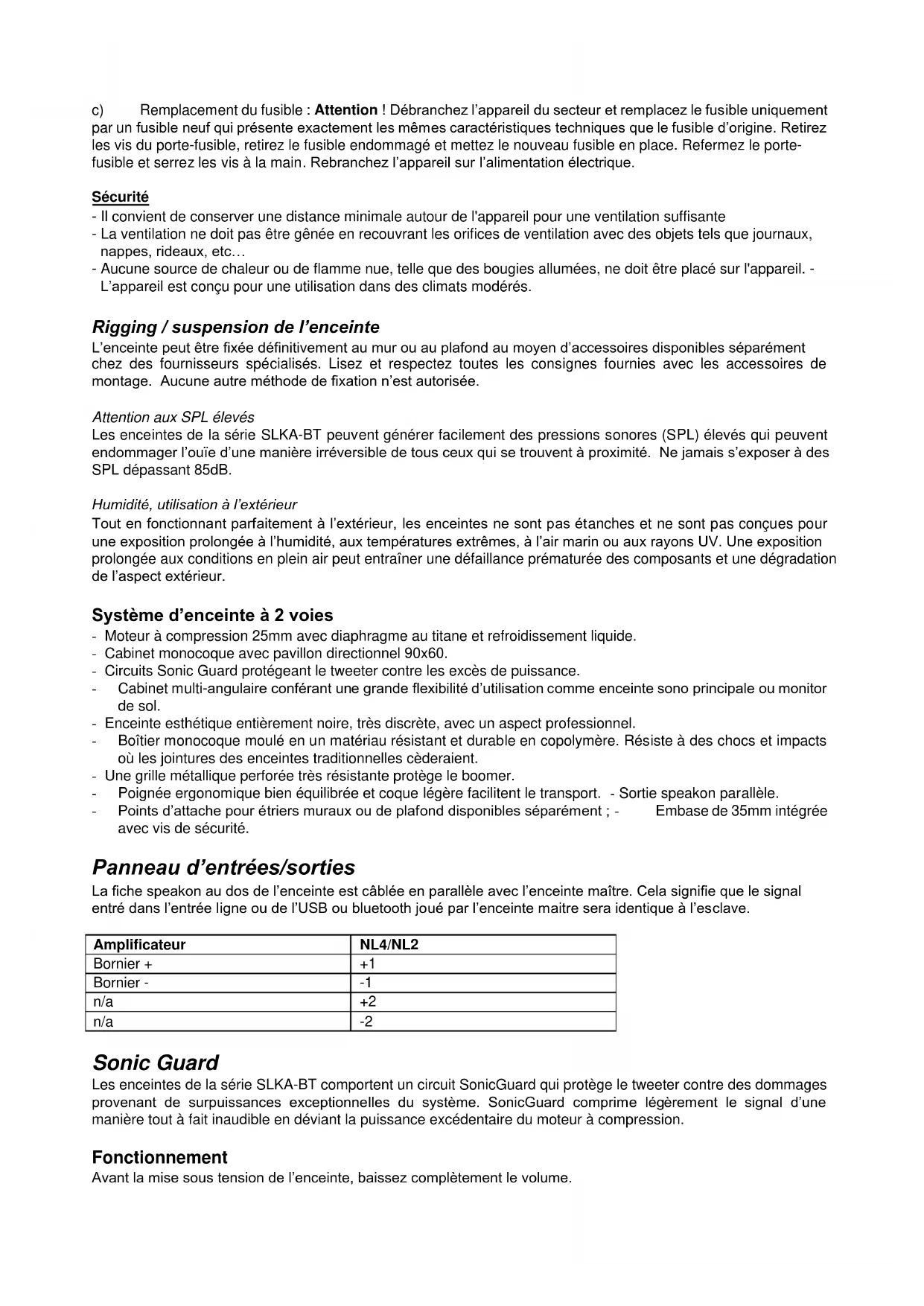 Lire et conserver le manuel et les consignes de sécurité pour référence ultérieure. Dispositifs de coupure du réseau a) lorsque le cordon d'alimentation ou un coupleur d'appareil est utilisé comme dispositif de déconnexion, ce dispositif doit rester facilement accessible; b) Si un interrupteur omnipolaire est utilisé comme dispositif de déconnexion, l'emplacement sur l'appareil et la fonction de l'interrupteur doit être décrite, et le commutateur doit rester facilement accessible;c) Remplacement du fusible : Attention ! Débranchez l’appareil du secteur et remplacez le fusible uniquement par un fusible neuf qui présente exactement les mêmes caractéristiques techniques que le fusible d’origine. Retirez les vis du porte-fusible, retirez le fusible endommagé et mettez le nouveau fusible en place. Refermez le porte- fusible et serrez les vis à la main. Rebranchez l’appareil sur l’alimentation électrique. Sécurité - Il convient de conserver une distance minimale autour de l'appareil pour une ventilation suffisante - La ventilation ne doit pas être gênée en recouvrant les orifices de ventilation avec des objets tels que journaux, nappes, rideaux, etc… - Aucune source de chaleur ou de flamme nue, telle que des bougies allumées, ne doit être placé sur l'appareil. - L’appareil est conçu pour une utilisation dans des climats modérés. Rigging / suspension de l’enceinte L’enceinte peut être fixée définitivement au mur ou au plafond au moyen d’accessoires disponibles séparément chez des fournisseurs spécialisés. Lisez et respectez toutes les consignes fournies avec les accessoires de montage. Aucune autre méthode de fixation n’est autorisée. Attention aux SPL élevés Les enceintes de la série SLKA-BT peuvent générer facilement des pressions sonores (SPL) élevés qui peuvent endommager l’ouïe d’une manière irréversible de tous ceux qui se trouvent à proximité. Ne jamais s’exposer à des SPL dépassant 85dB. Humidité, utilisation à l’extérieur Tout en fonctionnant parfaitement à l’extérieur, les enceintes ne sont pas étanches et ne sont pas conçues pour une exposition prolongée à l’humidité, aux températures extrêmes, à l’air marin ou aux rayons UV. Une exposition prolongée aux conditions en plein air peut entraîner une défaillance prématurée des composants et une dégradation de l’aspect extérieur. Système d’enceinte à 2 voies - Moteur à compression 25mm avec diaphragme au titane et refroidissement liquide. - Cabinet monocoque avec pavillon directionnel 90x60. - Circuits Sonic Guard protégeant le tweeter contre les excès de puissance. - Cabinet multi-angulaire conférant une grande flexibilité d’utilisation comme enceinte sono principale ou monitor de sol. - Enceinte esthétique entièrement noire, très discrète, avec un aspect professionnel. - Boîtier monocoque moulé en un matériau résistant et durable en copolymère. Résiste à des chocs et impacts où les jointures des enceintes traditionnelles cèderaient. - Une grille métallique perforée très résistante protège le boomer. - Poignée ergonomique bien équilibrée et coque légère facilitent le transport. - Sortie speakon parallèle. - Points d’attache pour étriers muraux ou de plafond disponibles séparément ; - Embase de 35mm intégrée avec vis de sécurité. Panneau d’entrées/sorties La fiche speakon au dos de l’enceinte est câblée en parallèle avec l’enceinte maître. Cela signifie que le signal entré dans l’entrée ligne ou de l’USB ou bluetooth joué par l’enceinte maitre sera identique à l’esclave. Amplificateur NL4/NL2 Bornier +