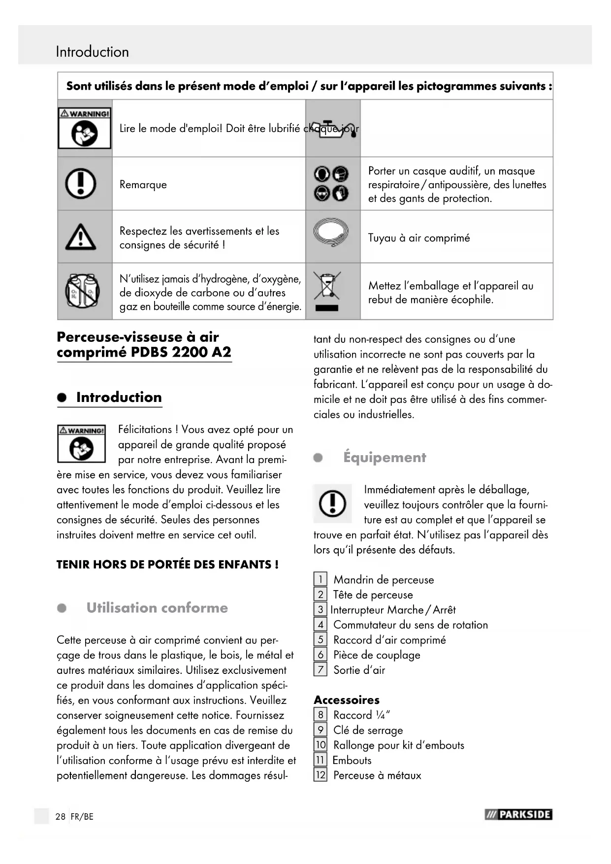 St. Ingbert, 31.03.2016 på vegne af Daniel Havener26 Table des matières27 FR/BE Introduction ................................................................................................................................... Page 28 Utilisation conforme ............................................................................................................................Page 28 Équipement .......................................................................................................................................... Page 28 Caractéristiques techniques ................................................................................................................Page 29 Consignes de sécurité pour les outils à air comprimé ...............................Page 29 Risques liés aux pièces projetées ....................................................................................................... Page 31 Risques liés au hapement / au bobinage ..........................................................................................Page 31 Risques liés au fonctionnement ...........................................................................................................Page 32 Risques liés aux mouvements répétés ................................................................................................Page 32 Risques liés aux accessoires ............................................................................................................... Page 32 Risques liés au lieu de travail .............................................................................................................Page 32 Risques liés à la poussière et aux vapeurs ........................................................................................Page 33 Risques liés au bruit .............................................................................................................................Page 33 Risques liés aux oscillations ................................................................................................................ Page 33 Consignes de sécurité supplémentaires pour les machines pneumatiques .....................................Page 34 Mise en marche .......................................................................................................................... Page 34 Insérer un embout ou un foret ............................................................................................................Page 34 Raccordements .................................................................................................................................... Page 34 Réglage de l‘air comprimé ................................................................................................................. Page 35 Mise en service ...................................................................................................................................Page 35 Modification du sens de rotation .......................................................................................................Page 35 Après la mise en marche ....................................................................................................Page 35 Maintenance .................................................................................................................................Page 35 Nettoyage et entretien ........................................................................................................ Page 36 Remarques sur la garantie et le service après-vente ................................Page 36 Conditions de garantie .......................................................................................................................Page 36 Étendue de la garantie .......................................................................................................................Page 37 Faire valoir sa garantie .......................................................................................................................Page 37 Consignes environnementales et informations sur la mise au rebut ................................................................................................................Page 38 Déclaration de conformité ................................................................................................ Page 38 Table des matières28 FR/BE Introduction / Consignes de sécurité pour les outils à air compriméIntroduction Perceuse-visseuse à air comprimé PDBS 2200 A2 Introduction Félicitations! Vous avez opté pour un appareil de grande qualité proposé par notre entreprise. Avant la premi- ère mise en service, vous devez vous familiariser avec toutes les fonctions du produit. Veuillez lire attentivement le mode d’emploi ci-dessous et les consignes de sécurité. Seules des personnes instruites doivent mettre en service cet outil. TENIR HORS DE PORTÉE DES ENFANTS! Utilisation conforme Cette perceuse à air comprimé convient au per- çage de trous dans le plastique, le bois, le métal et autres matériaux similaires. Utilisez exclusivement ce produit dans les domaines d’application spéci- fiés, en vous conformant aux instructions. Veuillez conserver soigneusement cette notice. Fournissez également tous les documents en cas de remise du produit à un tiers. Toute application divergeant de l‘utilisation conforme à l‘usage prévu est interdite et potentiellement dangereuse. Les dommages résul- tant du non-respect des consignes ou d‘une utilisation incorrecte ne sont pas couverts par la garantie et ne relèvent pas de la responsabilité du fabricant. L‘appareil est conçu pour un usage à do- micile et ne doit pas être utilisé à des fins commer- ciales ou industrielles. Équipement Immédiatement après le déballage, veuillez toujours contrôler que la fourni- ture est au complet et que l’appareil se trouve en parfait état. N‘utilisez p