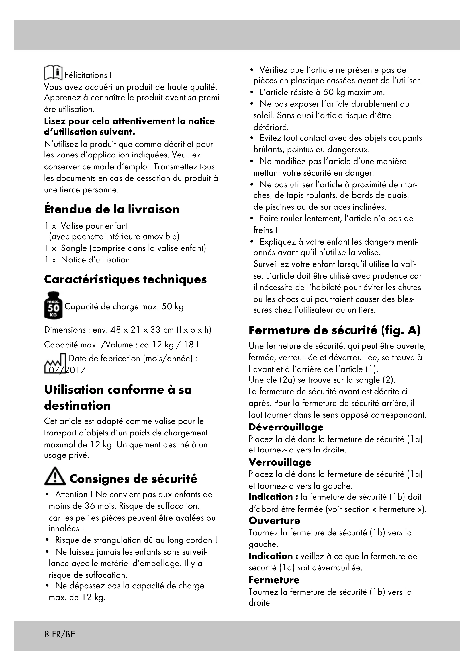 - Expliquez à votre enfant les dangers menti- onnés avant qu‘il n’utilise la valise. Surveillez votre enfant lorsqu‘il utilise la vali- se. L‘article doit être utilisé avec prudence car il nécessite de l‘habileté pour éviter les chutes ou les chocs qui pourraient causer des bles- sures chez l‘utilisateur ou un tiers. Fermeture de sécurité (fig. A) Une fermeture de sécurité, qui peut être ouverte, fermée, verrouillée et déverrouillée, se trouve à l‘avant et à l‘arrière de l‘article (1). Une clé (2a) se trouve sur la sangle (2). La fermeture de sécurité avant est décrite ci- après. Pour la fermeture de sécurité arrière, il faut tourner dans le sens opposé correspondant. Déverrouillage Placez la clé dans la fermeture de sécurité (1a) et tournez-la vers la droite. Verrouillage Placez la clé dans la fermeture de sécurité (1a) et tournez-la vers la gauche. Indication : la fermeture de sécurité (1b) doit d‘abord être fermée (voir section « Fermeture »). Ouverture Tournez la fermeture de sécurité (1b) vers la gauche. Indication : veillez à ce que la fermeture de sécurité (1a) soit déverrouillée. Fermeture Tournez la fermeture de sécurité (1b) vers la droite.9FR/BE Fixation de la sangle (fig. B) Placez le mousqueton (2c) de la sangle sur un ou deux des anneaux (1c). La boucle de réglage (2b) permet de régler la longueur de la sangle de manière variable. Utilisation En plus du transport d‘objets, un enfant de 50 kg maximum peut s‘asseoir sur l‘article et avancer avec celui-ci. Entretien, stockage S. v. p. n‘oubliez jamais qu‘un entretien et nettoyage réguliers contribuent à la sécurité et conservation de l‘article. Veuillez toujours en- treposer l’article dans un endroit sec et propre, dans une pièce tempérée. IMPORTANT ! Nettoyer uniquement avec de l’eau et ne jamais utiliser des produits de netto- yage abrasifs. Essuyez ensuite l’article avec un chiffon de nettoyage sec. Mise au rebut Éliminez l‘article et le matériel d‘emballage conformément aux directives locales en vigueur. Le matériel d‘emballage tel que les sachets en plastique par exemple ne doivent pas arriver dans les mains des enfants. Conservez le matéri- el d‘emballage hors de portée des enfants. Ce produit est recyclable. Il est soumis à la responsabilité élargie du fabricant et est collecté séparément. Indications concernant la garantie et le service après-vente Le produit a été fabriqué avec le plus grand soin et sous un contrôle permanent. Vous avez sur ce produit une garantie de trois ans à partir de la date d’achat. Conservez le ticket de caisse. La garantie est uniquement valable pour les défauts de matériaux et de fabrication, elle perd sa validité en cas de maniement incorrect ou non conforme. Vos droits légaux, tout particulière- ment les droits relatifs à la garantie, ne sont pas limitées par cette garantie. En cas d‘éventuelles réclamations, veuillez vous adresser à la hotline de garantie indiquée ci- dessous ou nous contacter par e-mail. Nos employés du service client vous indiqueront la marche à suivre le plus rapidement possible. Nous vous renseignerons personnellement dans tous les cas. La période de garantie n‘est pas prolongée par d’éventuelles réparations sous la garantie, les garanties implicites ou le remboursement. Ceci s‘applique également aux pièces rempla- cées et réparées. Les réparations nécessaires sont à la charge de l’acheteur à la fin de la période de garantie. Article L217-16 du Code de la consommation Lorsque l‘acheteur demande au vendeur, pendant le cours de la garantie commerciale qui lui a été consentie lors de l‘acquisition ou de la réparation d‘un bien meuble, une remise en état couverte par la garantie, toute période d‘immobilisation d‘au moins sept jours vient s‘ajouter à la durée de la garantie qui restait à courir. Cette période court à compter de la demande d‘intervention de l‘acheteur ou de la mise à disposition pour réparation du bien en cause, si cette mise à disposition est postérieure à la demande d‘intervention. Indépendamment de la garantie commerciale souscrite, le vendeur reste tenu des défauts de conformité du bien et des vices rédhibitoires dans les conditions prévues aux articles L217-4 à L217-13 du Code de la consommation et aux articles 1641 à 1648 et 2232 du Code Civil. Article L217-4 du Code de la consommation Le vendeur livre un bien conforme au contrat et répond des défauts de conformité existant lors de la délivrance.10 FR/BE Il répond également des défauts de conformité résultant de l‘emballage, des instructions de montage ou de l‘installation lorsque celle-ci a été mise à sa charge par le contrat ou a été réalisée sous sa responsabilité. Article L217-5 du Code de la consommation Le bien est conforme au contrat : 1° S´il est propre à l‘usage habituellement attendu d‘un bien semblable et, le cas échéant :
