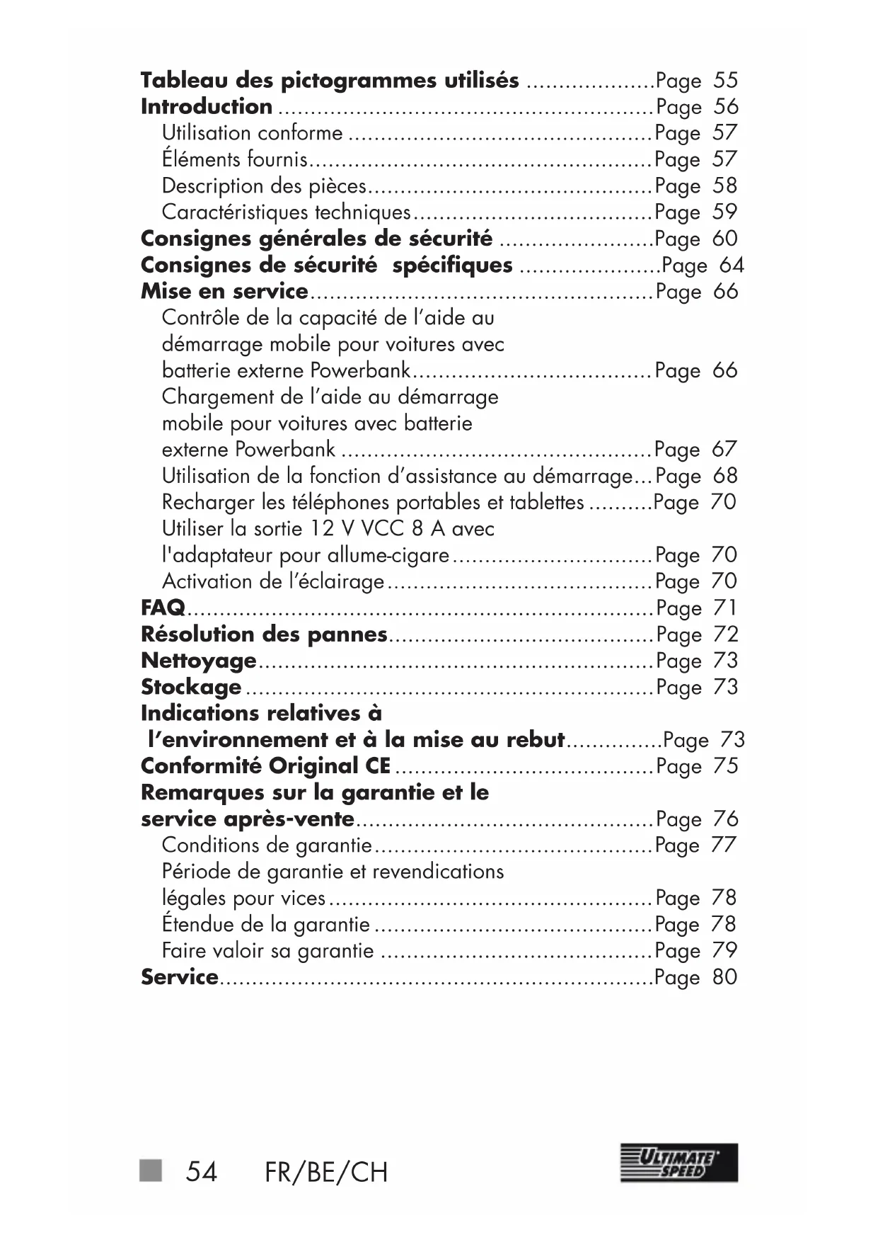 Sac de rangement REMARQUE: Le terme «Produit» ou «Appareil» employé dans le texte ci-après se rapporte à l’aide au démarrage mobile pour voitures avec batterie externe Powerbank citée dans le présent mode d'emploi. z Caractéristiques techniques La mise en série des quatre cellules individuelles constituant la batterie permet une capacité de 3000 mAh pour une tension totale de 4 x 3,2 V = 12 V. La puissance résultante correspond à la puissance d’une batterie ayant une capacité de 12000 mAh pour 3,2 V. Modèle: UMAP12000B2 Type de batterie: Accumulateur Lithium Polymère (F8054106) Batterie, système chimique: Lithium phosphate de fer (LiFePO4) Capacité de batterie: 12000 mAh, 3,2 V / 38,4Wh Cycles de charge: 1500 Temps de charge: max. 13,5 heures avec un courant de charge de 1A Courant de crête: 500 A Courant de démarrage: 300 A60 FR/BE/CH Température de service Powerbank: 0–60 °C Température d’utilisation LED: -21 °C – 60 °C Tension: 12 V Tension d’entrée (branchement de recharge): 5 V / 1A (USB-C) Capacité: 7000 mAh / 5 V Tension de sortie (sortie USB): 5 V / 1 A/2 A Remarque: Uniquement pour moteurs à essence d’une cylindrée maximale de 3 litres et moteurs Diesel d’une cylindrée maximale de 2 litres. Des modifications techniques et visuelles peuvent être apportées sans préavis dans le cadre du développement continu. Pour cette raison, toutes les dimensions, remarques et indications de ce mode d’emploi sont fournies sans garantie. Toute prétention légale formulée sur la base de ce mode d’emploi ne pourra donc faire valoir d’aucun droit. z Consignes générales de sécurité Ce paragraphe traite des prescriptions de sécurité de base à observer lors de la manipulation de l’appareil. Sécurité des personnes: Cet appareil peut être utilisé par des enfants à partir de 8ans et plus ainsi que par des personnes avec des capacités physiques, sensorielles ou mentales réduites ou manquant d’expérience et deFR/BE/CH