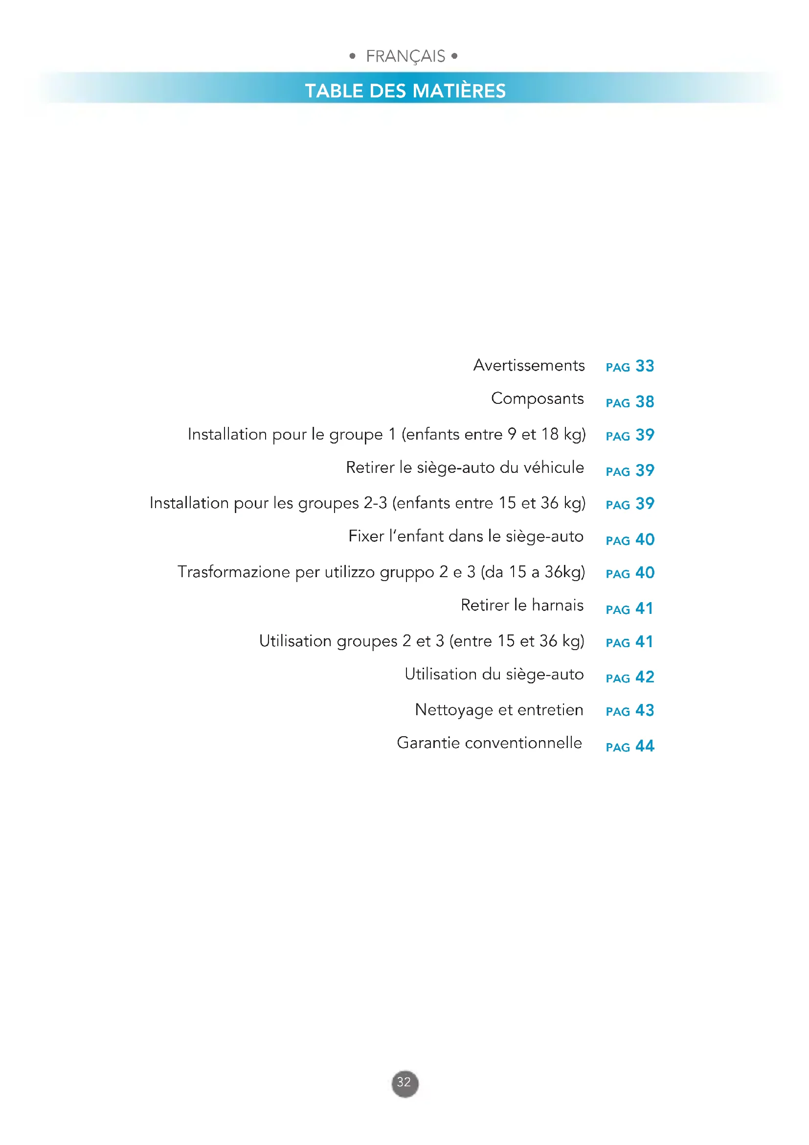 pag 33 pag 38 pag 39 pag 39 pag 39 pag 40 pag 40 pag 41 pag 41 pag 42 pag 43 pag 44 Avertissements Composants Installation pour le groupe 1 (enfants entre 9 et 18 kg) Retirerlesiège-autoduvéhicule Installation pour les groupes 2-3 (enfants entre 15 et 36 kg) Fixer l’enfant dans le siège-auto Trasformazione per utilizzo gruppo 2 e 3 (da 15 a 36kg) Retirer le harnais Utilisation groupes 2 et 3 (entre 15 et 36 kg) Utilisation du siège-auto Nettoyage et entretien Garantie conventionnelle• FRANÇAIS •