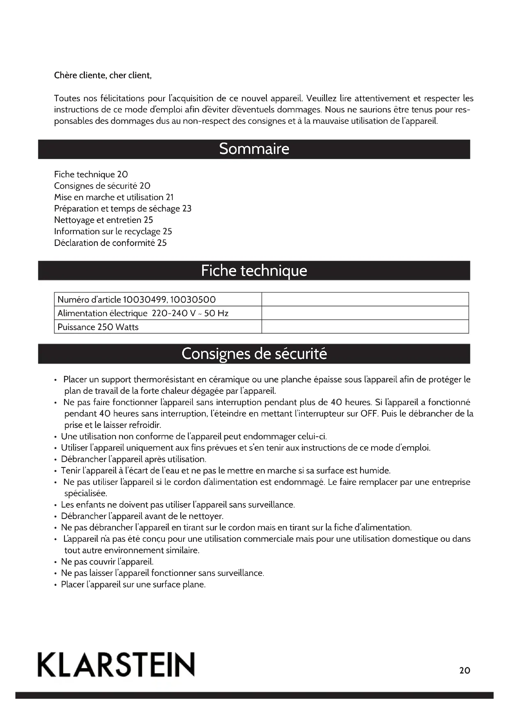 - Ne pas utiliser de produit abrasif ou d’éponge abrasive pour ne pas endommager le revêtement de l’appareil. Information sur le recyclage Vous trouverez sur le produit l’image ci-contre (une poubelle sur roues, barrée d‘une croix), ce qui indique que le produit se trouve soumis à la directive européenne 2002/96/CE. Renseignez-vous sur les dispositions en vigueur dans votre région concernant la collecte séparée des appareils électriques et électroniques. Respectez-les et ne jetez pas les ap- pareils usagés avec les ordures ménagères. La mise au rebut correcte du produit usagé per- met de préserver l’environnement et la santé. Le recyclage des matériaux contribue à la préservation des ressources naturelles. Déclaration de conformité Fabricant : Chal-Tec GmbH, Wallstraße 16, 10179 Berlin, Allemagne. Ce produit est conforme aux directives européennes suivantes : 2014/30/UE (CEM) 2011/65/UE (RoHS) 2014/35/UE (LVD)26 Gentile cliente, La ringraziamo per aver acquistato il nostro prodotto. La preghiamo di leggere attentamente le seguenti istru- zioni e di seguirle per evitare eventuali danni. Non ci assumiamo alcuna responsabilità per danni derivati da una mancata osservazione delle avvertenze di sicurezza e da un uso improprio del dispositivo. Indice Dati tecnici 26 Avvertenze di sicurezza 26 Messa in funzione e utilizzo 27 Preparazione e tempi di essiccazione 29 Pulizia e manutenzione 31 Smaltimento 31 Dichiarazione di conformità 31 Dati tecnici Articolo numero 10030499, 10030500 Alimentazione 220-240 V ~ 50 Hz Potenza 250 Watt Avvertenze di sicurezza