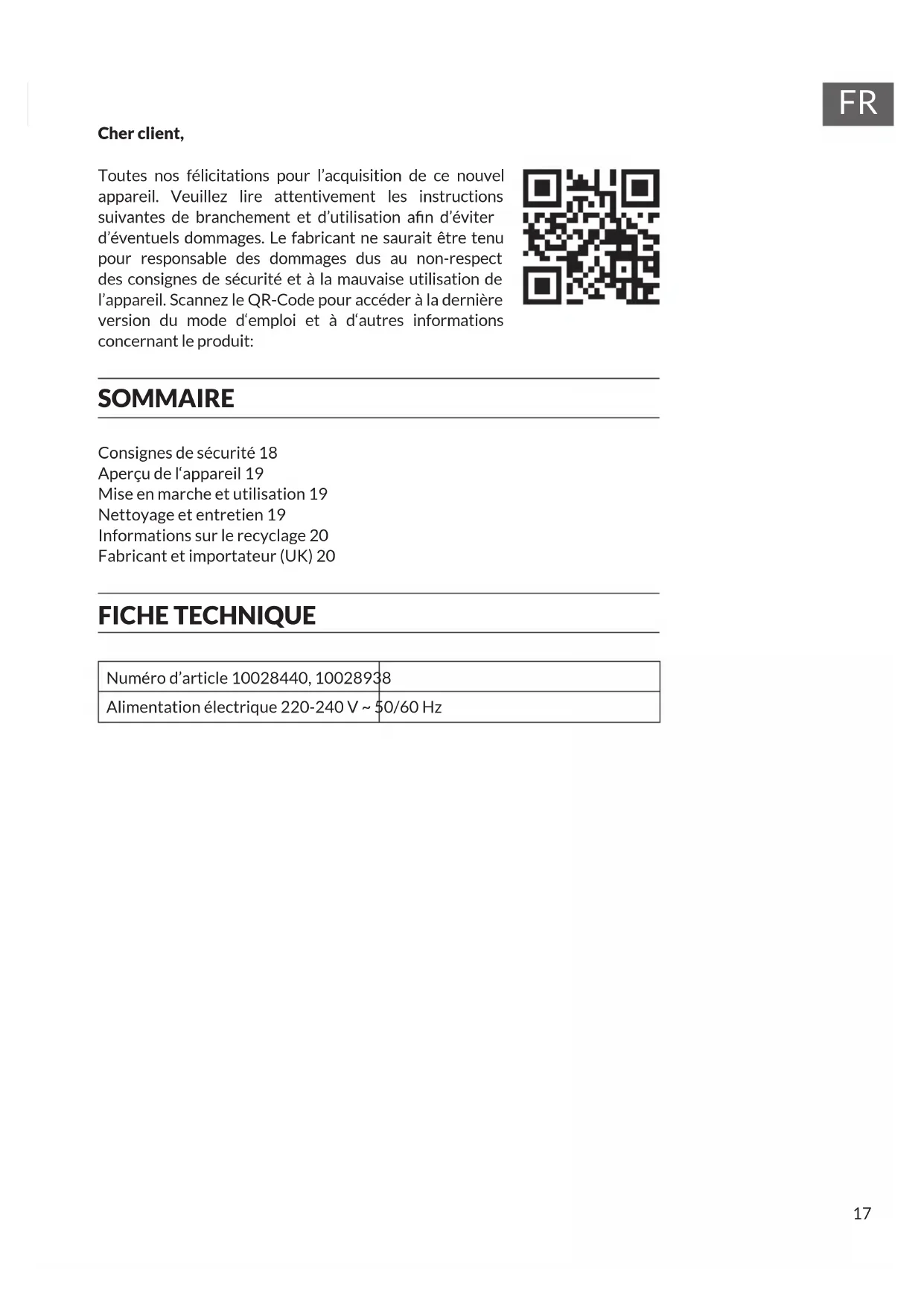 Cher client, Toutes nos félicitations pour l’acquisition de ce nouvel appareil. Veuillez lire attentivement les instructions suivantes de branchement et d’utilisation an d’éviter d’éventuels dommages. Le fabricant ne saurait être tenu pour responsable des dommages dus au non-respect des consignes de sécurité et à la mauvaise utilisation de l’appareil. Scannez le QR-Code pour accéder à la dernière version du mode d‘emploi et à d‘autres informations concernant le produit: SOMMAIRE Consignes de sécurité 18 Aperçu de l‘appareil 19 Mise en marche et utilisation 19 Nettoyage et entretien 19 Informations sur le recyclage 20 Fabricant et importateur (UK) 20 FICHE TECHNIQUE Numéro d’article 10028440, 10028938 Alimentation électrique 220-240 V ~ 50/60 Hz18