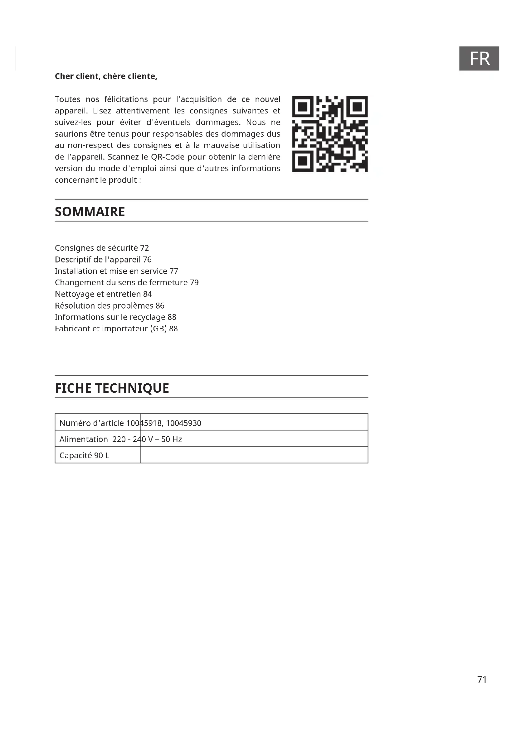 Cher client, chère cliente, Toutes nos félicitations pour l’acquisition de ce nouvel appareil. Lisez attentivement les consignes suivantes et suivez-les pour éviter d'éventuels dommages. Nous ne saurions être tenus pour responsables des dommages dus au non-respect des consignes et à la mauvaise utilisation de l’appareil. Scannez le QR-Code pour obtenir la dernière version du mode d'emploi ainsi que d'autres informations concernant le produit : SOMMAIRE FICHE TECHNIQUE Numéro d'article 10045918, 10045930 Alimentation 220 - 240 V – 50 Hz Capacité 90 L Anglais 27 Espagnol Français Italien Consignes de sécurité 72 Descriptif de l'appareil 76 Installation et mise en service 77 Changement du sens de fermeture 79 Nettoyage et entretien 84 Résolution des problèmes 86 Informations sur le recyclage 88 Fabricant et importateur (GB) 8872