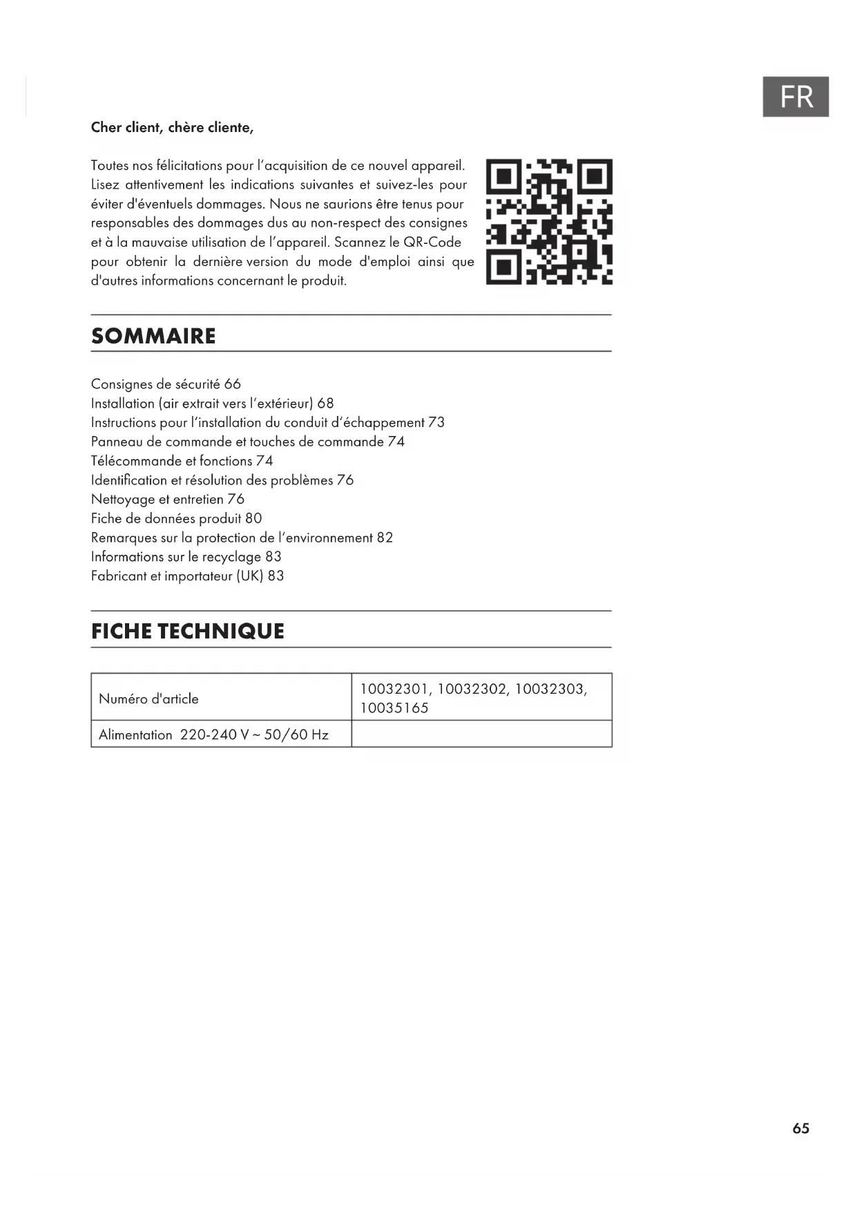 Cher client, chère cliente, Toutes nos félicitations pour l’acquisition de ce nouvel appareil. Lisez attentivement les indications suivantes et suivez-les pour éviter d'éventuels dommages. Nous ne saurions être tenus pour responsables des dommages dus au non-respect des consignes et à la mauvaise utilisation de l’appareil. Scannez le QR-Code pour obtenir la dernière version du mode d'emploi ainsi que d'autres informations concernant le produit. SOMMAIRE Consignes de sécurité66 Installation (air extrait vers l‘extérieur)68 Instructions pour l‘installation du conduit d‘échappement73 Panneau de commande et touches de commande74 Télécommande et fonctions74 Identication et résolution des problèmes76 Nettoyage et entretien76 Fiche de données produit80 Remarques sur la protection de l‘environnement82 Informations sur le recyclage83 Fabricant et importateur (UK)83 FICHE TECHNIQUE Numéro d'article 10032301, 10032302, 10032303,