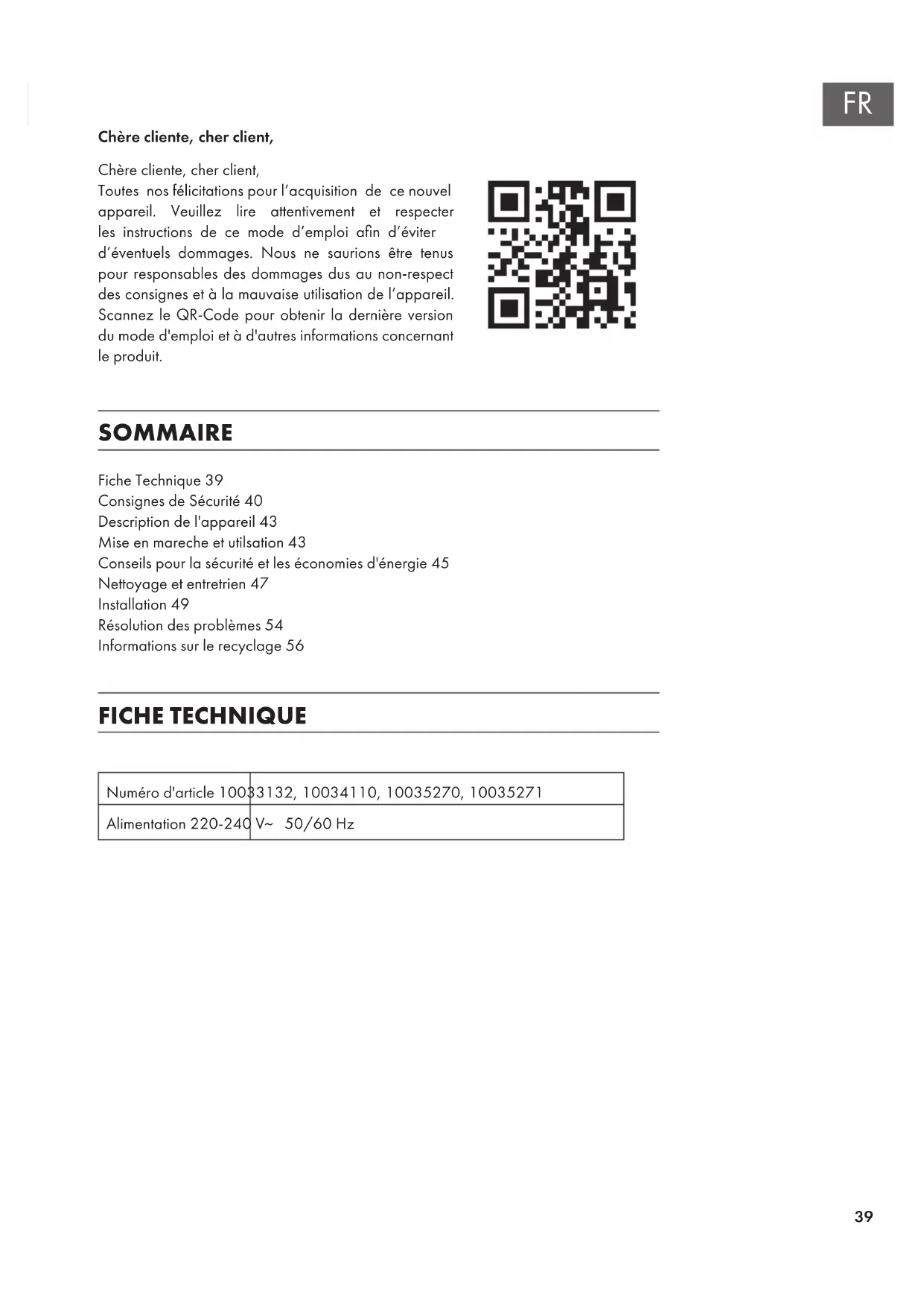 Fiche Technique 39 Consignes de Sécurité 40 Description de l'appareil 43 Mise en mareche et utilsation 43 Conseils pour la sécurité et les économies d'énergie 45 Nettoyage et entretrien 47 Installation 49 Résolution des problèmes 54 Informations sur le recyclage 56 FICHE TECHNIQUE Numéro d'article 10033132, 10034110, 10035270, 10035271 Alimentation 220-240 V~ 50/60 Hz Chère cliente, cher client, Chère cliente, cher client, Toutes nos félicitations pour l’acquisition de ce nouvel appareil. Veuillez lire attentivement et respecter les instructions de ce mode d’emploi an d’éviter d’éventuels dommages. Nous ne saurions être tenus pour responsables des dommages dus au non-respect des consignes et à la mauvaise utilisation de l’appareil. Scannez le QR-Code pour obtenir la dernière version du mode d'emploi et à d'autres informations concernant le produit. SOMMAIRE40