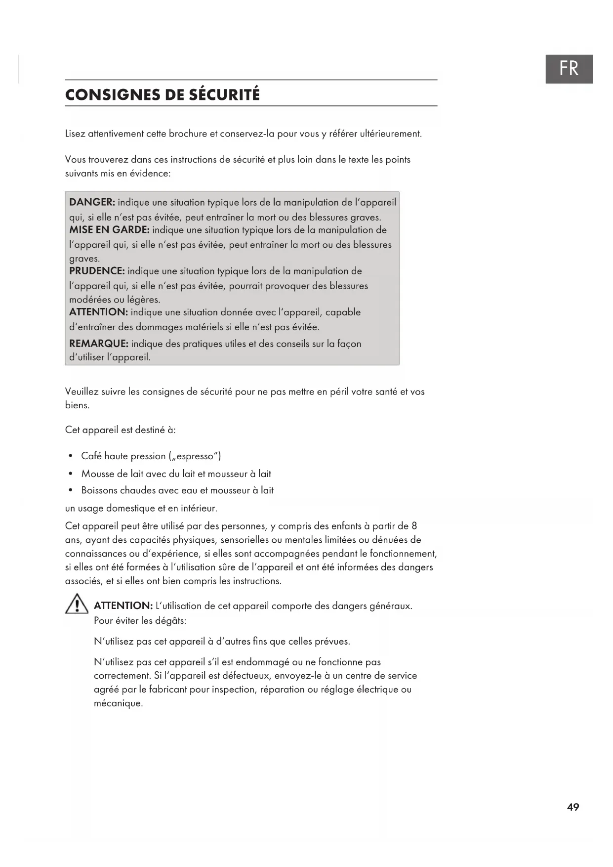 - Boissons chaudes avec eau et mousseur à lait un usage domestique et en intérieur. Cet appareil peut être utilisé par des personnes, y compris des enfants à partir de 8 ans, ayant des capacités physiques, sensorielles ou mentales limitées ou dénuées de connaissances ou d‘expérience, si elles sont accompagnées pendant le fonctionnement, si elles ont été formées à l‘utilisation sûre de l‘appareil et ont été informées des dangers associés, et si elles ont bien compris les instructions. ATTENTION: L‘utilisation de cet appareil comporte des dangers généraux. Pour éviter les dégâts: N‘utilisez pas cet appareil à d‘autres ns que celles prévues. N‘utilisez pas cet appareil s‘il est endommagé ou ne fonctionne pas correctement. Si l‘appareil est défectueux, envoyez-le à un centre de service agréé par le fabricant pour inspection, réparation ou réglage électrique ou mécanique.50