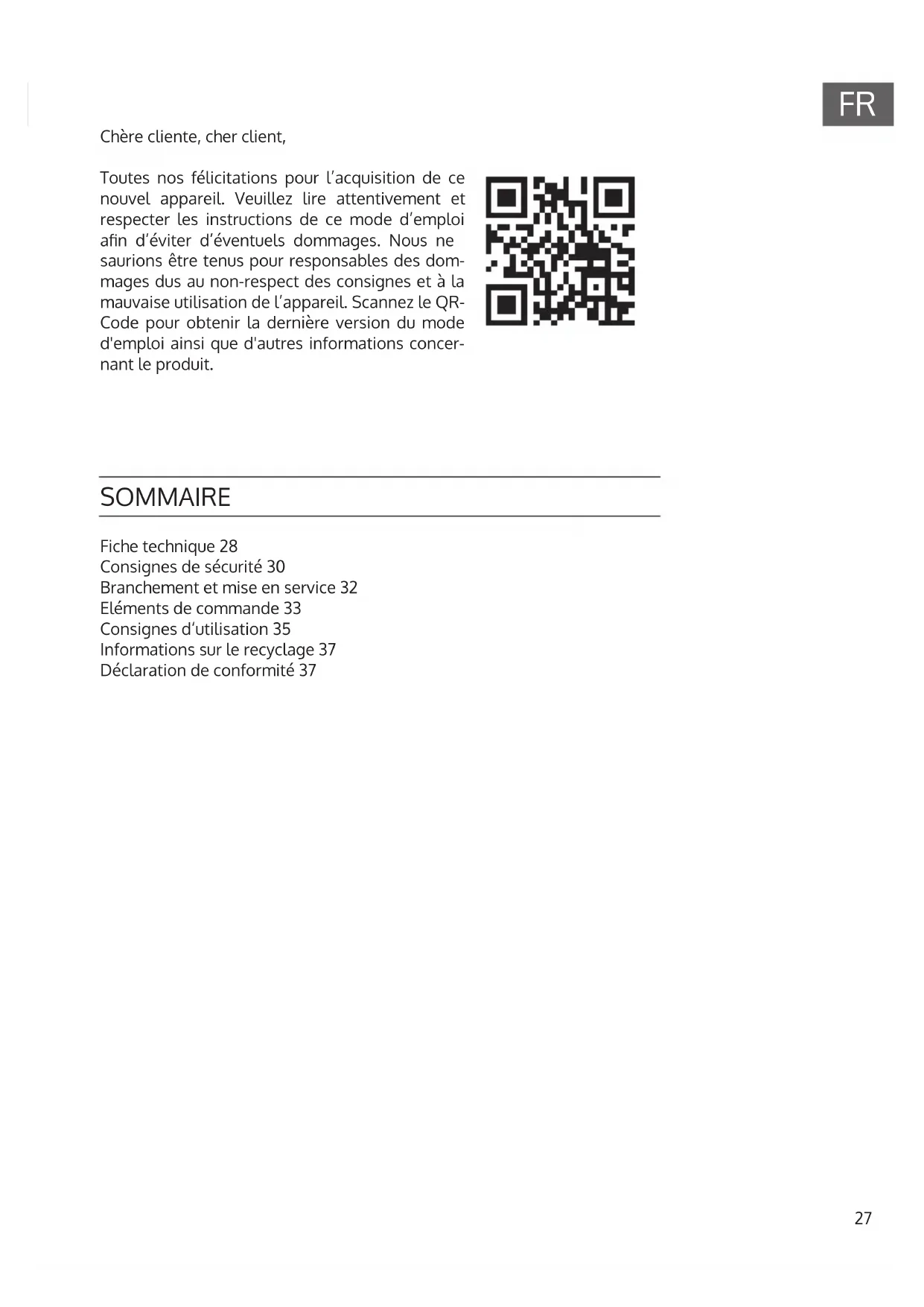 SOMMAIRE Fiche technique 28 Consignes de sécurité 30 Branchement et mise en service 32 Eléments de commande 33 Consignes d‘utilisation 35 Informations sur le recyclage 37 Déclaration de conformité 37 Chère cliente, cher client, Toutes nos félicitations pour l’acquisition de ce nouvel appareil. Veuillez lire attentivement et respecter les instructions de ce mode d’emploi an d’éviter d’éventuels dommages. Nous ne saurions être tenus pour responsables des dom- mages dus au non-respect des consignes et à la mauvaise utilisation de l’appareil. Scannez le QR- Code pour obtenir la dernière version du mode d'emploi ainsi que d'autres informations concer- nant le produit.28