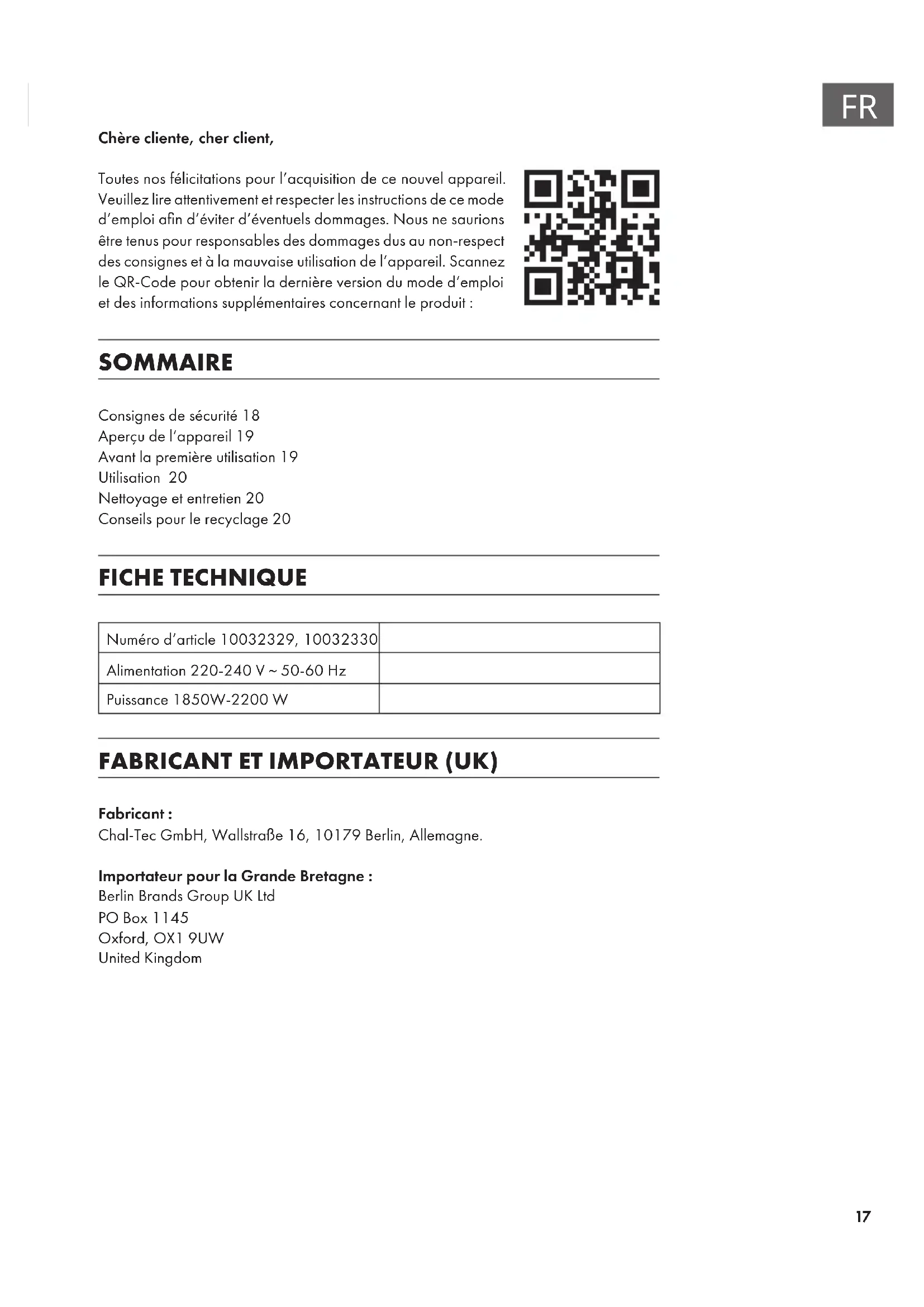 Chère cliente, cher client, Toutes nos félicitations pour l’acquisition de ce nouvel appareil. Veuillez lire attentivement et respecter les instructions de ce mode d’emploi an d’éviter d’éventuels dommages. Nous ne saurions être tenus pour responsables des dommages dus au non-respect des consignes et à la mauvaise utilisation de l’appareil. Scannez le QR-Code pour obtenir la dernière version du mode d‘emploi et des informations supplémentaires concernant le produit : SOMMAIRE Consignes de sécurité18 Aperçu de l‘appareil19 Avant la première utilisation19 Utilisation 20 Nettoyage et entretien20 Conseils pour le recyclage20 FICHE TECHNIQUE Numéro d’article 10032329, 10032330 Alimentation 220-240 V ~ 50-60 Hz Puissance 1850W-2200 W FABRICANT ET IMPORTATEUR (UK) Fabricant : Chal-Tec GmbH, Wallstraße 16, 10179 Berlin, Allemagne. Importateur pour la Grande Bretagne : Berlin Brands Group UK Ltd PO Box 1145 Oxford, OX1 9UW United Kingdom18
