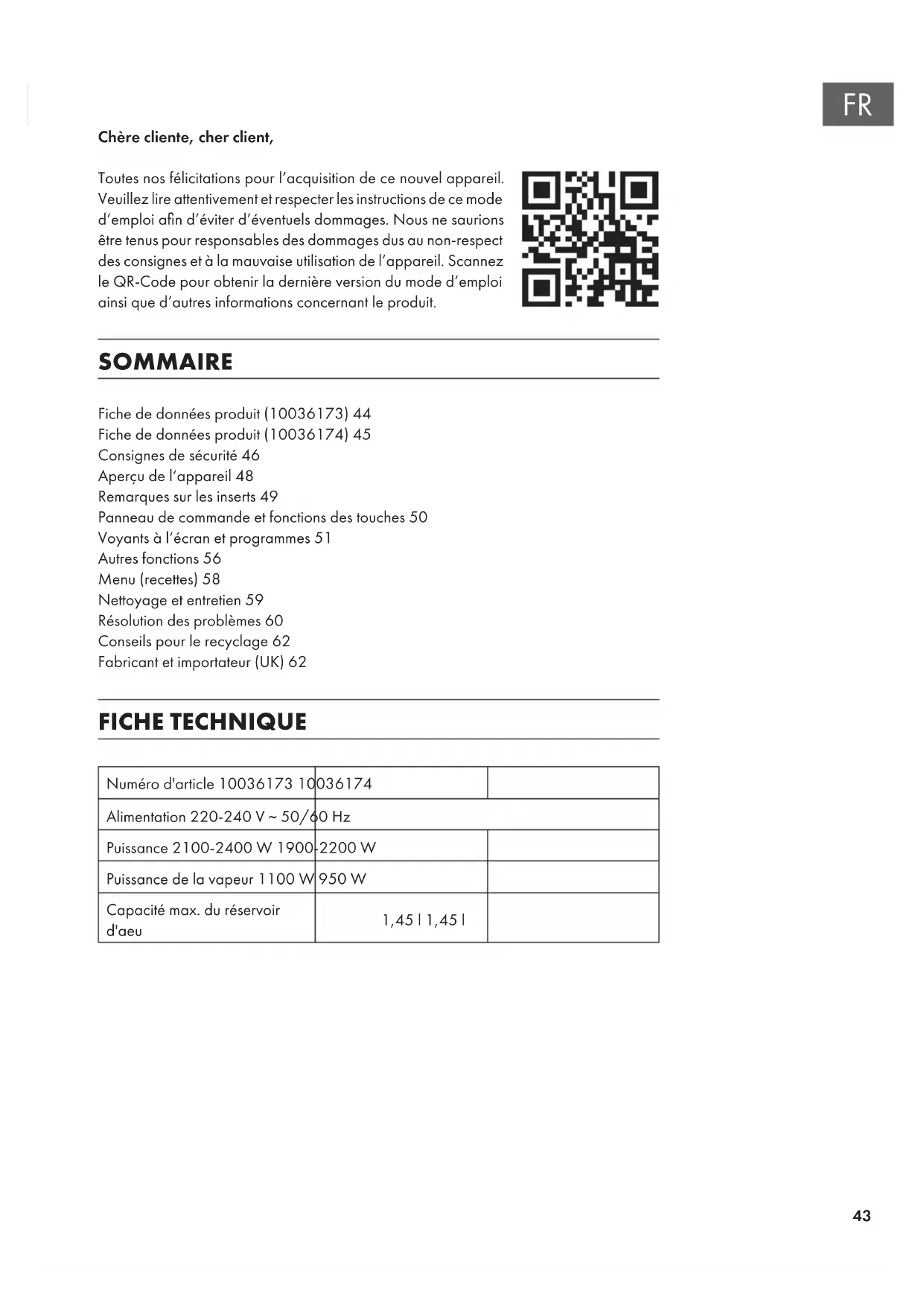 Chère cliente, cher client, Toutes nos félicitations pour l’acquisition de ce nouvel appareil. Veuillez lire attentivement et respecter les instructions de ce mode d’emploi an d’éviter d’éventuels dommages. Nous ne saurions être tenus pour responsables des dommages dus au non-respect des consignes et à la mauvaise utilisation de l’appareil. Scannez le QR-Code pour obtenir la dernière version du mode d’emploi ainsi que d’autres informations concernant le produit. SOMMAIRE Fiche de données produit (10036173)44 Fiche de données produit (10036174)45 Consignes de sécurité46 Aperçu de l‘appareil48 Remarques sur les inserts49 Panneau de commande et fonctions des touches50 Voyants à l‘écran et programmes51 Autres fonctions56 Menu (recettes)58 Nettoyage et entretien59 Résolution des problèmes60 Conseils pour le recyclage62 Fabricant et importateur (UK)62 FICHE TECHNIQUE Numéro d'article 10036173 10036174 Alimentation 220-240 V ~ 50/60 Hz Puissance 2100-2400 W 1900-2200 W Puissance de la vapeur 1100 W 950 W Capacité max. du réservoir d'aeu 1,45 l 1,45 l44