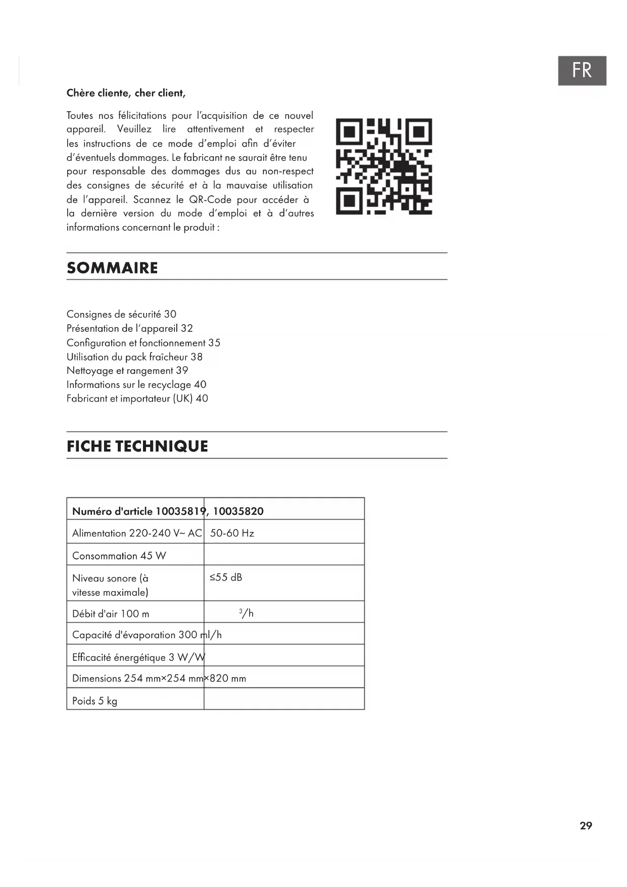 Consignes de sécurité 30 Présentation de l‘appareil 32 Conguration et fonctionnement 35 Utilisation du pack fraîcheur 38 Nettoyage et rangement 39 Informations sur le recyclage 40 Fabricant et importateur (UK) 40 SOMMAIRE FICHE TECHNIQUE Numéro d'article 10035819, 10035820 Alimentation 220-240 V~ AC 50-60 Hz Consommation 45 W Niveau sonore (à vitesse maximale) ≤55dB Débit d'air 100m