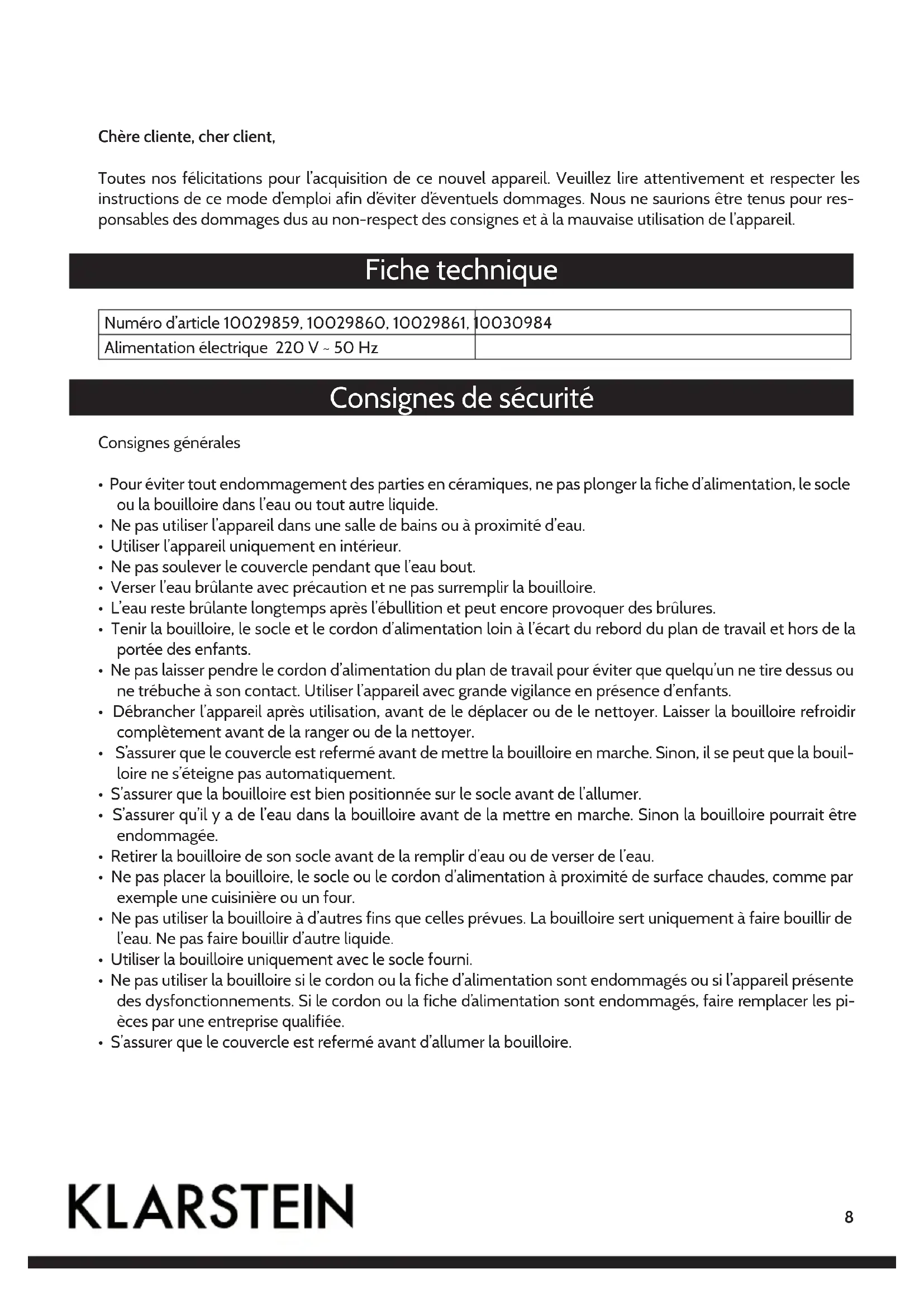- S’assurer que le couvercle est refermé avant d’allumer la bouilloire.9 Consignes spéciales