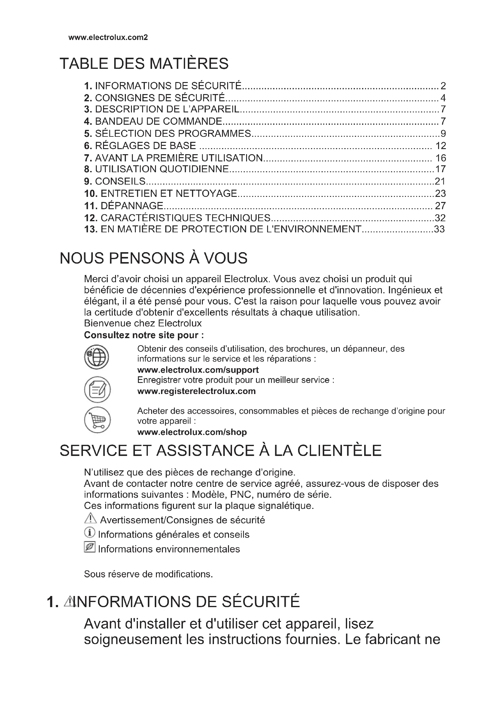 Merci d’avoir choisi un appareil Electrolux. Vous avez choisi un produit qui bénéficie de décennies d'expérience professionnelle et d'innovation. Ingénieux et élégant, il a été pensé pour vous. C'est la raison pour laquelle vous pouvez avoir la certitude d'obtenir d'excellents résultats à chaque utilisation. Bienvenue chez Electrolux Consultez notre site pour : Obtenir des conseils d’utilisation, des brochures, un dépanneur, des informations sur le service et les réparations : www.electrolux.com/support Enregistrer votre produit pour un meilleur service : www.registerelectrolux.com Acheter des accessoires, consommables et pièces de rechange d’origine pour votre appareil : www.electrolux.com/shop