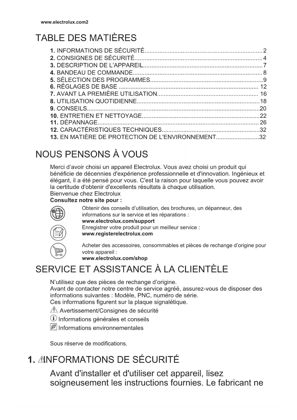 Merci d’avoir choisi un appareil Electrolux. Vous avez choisi un produit qui bénéficie de décennies d'expérience professionnelle et d'innovation. Ingénieux et élégant, il a été pensé pour vous. C'est la raison pour laquelle vous pouvez avoir la certitude d'obtenir d'excellents résultats à chaque utilisation. Bienvenue chez Electrolux Consultez notre site pour : Obtenir des conseils d’utilisation, des brochures, un dépanneur, des informations sur le service et les réparations : www.electrolux.com/support Enregistrer votre produit pour un meilleur service : www.registerelectrolux.com Acheter des accessoires, consommables et pièces de rechange d’origine pour votre appareil : www.electrolux.com/shop