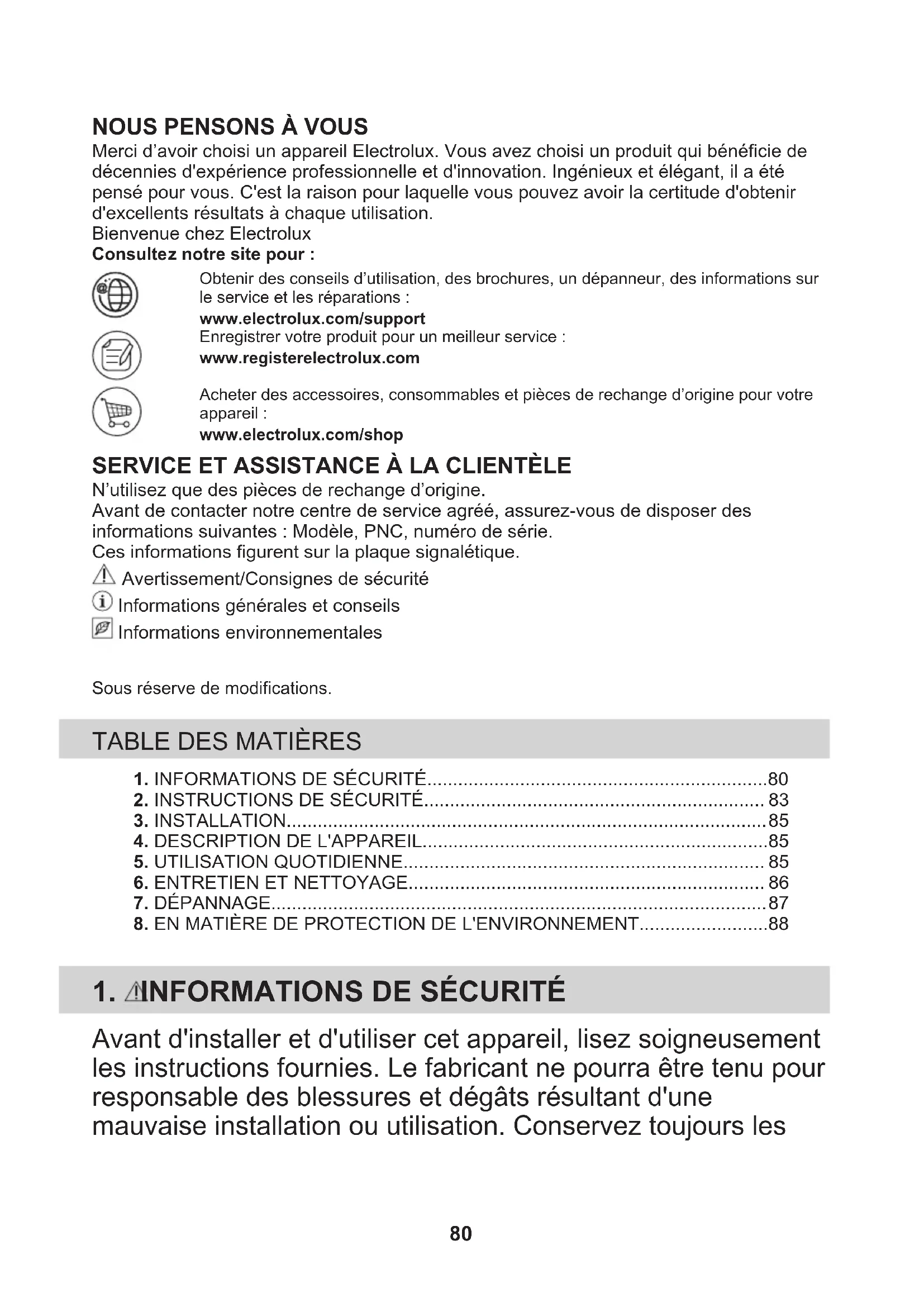 Merci d’avoir choisi un appareil Electrolux. Vous avez choisi un produit qui bénéficie dedécennies d'expérience professionnelle et d'innovation. Ingénieux et élégant, il a étépensé pour vous. C'est la raison pour laquelle vous pouvez avoir la certitude d'obtenird'excellents résultats à chaque utilisation.Bienvenue chez ElectroluxConsultez notre site pour :Obtenir des conseils d’utilisation, des brochures, un dépanneur, des informations surle service et les réparations :www.electrolux.com/supportEnregistrer votre produit pour un meilleur service :www.registerelectrolux.comAcheter des accessoires, consommables et pièces de rechange d’origine pour votreappareil :www.electrolux.com/shop