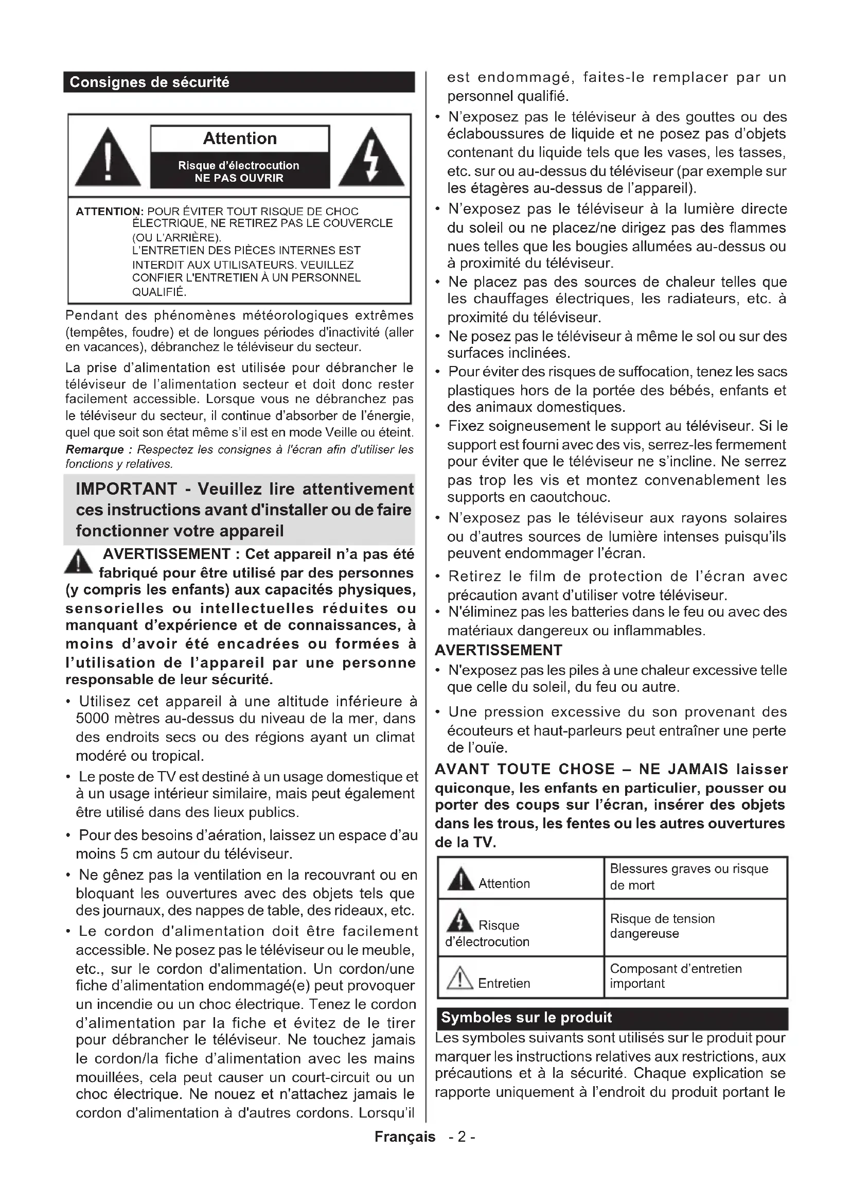- Une pression excessive du son provenant des écouteurs et haut-parleurs peut entraîner une perte de l’ouïe. AVANT TOUTE CHOSE – NE JAMAIS laisser quiconque, les enfants en particulier, pousser ou porter des coups sur l’écran, insérer des objets dans les trous, les fentes ou les autres ouvertures de la TV. Attention Blessures graves ou risque de mort Risque d’électrocution Risque de tension dangereuse Entretien Composant d’entretien important Symboles sur le produit Les symboles suivants sont utilisés sur le produit pour marquer les instructions relatives aux restrictions, aux précautions et à la sécurité. Chaque explication se rapporte uniquement à l’endroit du produit portant leFrançais - 3 - symbole correspondant. Veuillez en tenir compte pour des raisons de sécurité. Équipement de classe II : Cet appareil, de par sa conception, ne nécessite pas de branchement sécurisé à un système électrique de mise à la terre. Terminal Sous Tension Dangereux : Les bornes marquées, dans des conditions normales d’utilisation, sont dangereuses lorsqu’elles sont sous tension.