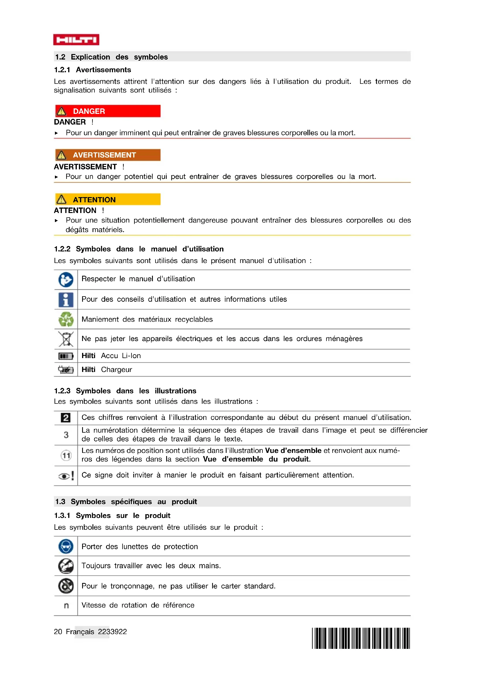 Attendre jusqu'à ce que le produit soit complètement arrêté avant de le déposer. ▶ Porter des gants de protection pour changer d'outil. Risque de blessures par coupure et de brûlures au contact avec l'outil amovible. ▶ Si le produit détecte un dépassement des valeurs limites de fonctionnement ou un accu vide, il peut arriver que l'outil ne soit pas freiné par le moteur. Utilisation et emploi soigneux de l’outil électroportatif ▶ Stocker et manipuler les disques conformément aux instructions du fabricant. ▶ Ne jamais utiliser le produit sans carter de protection. ▶ Bien fixer la pièce. Utiliser des dispositifs de serrage ou un étau pour fixer la pièce. Elle sera ainsi mieux tenue qu'à la main, et en outre, les deux mains restent libres pour commander le produit. ▶ Ne jamais ébarber avec un disque à tronçonner. ▶ Serrer fermement l'outil amovible et le flasque. Si l'outil amovible et le flasque ne sont pas bien serrés, il y a un risque après l'arrêt que l'outil amovible se détache de la broche lors du freinage par le moteur de l'appareil. ▶ Ne pas fixer de mousqueton de ceinture à ce produit. Sécurité relative au système électrique ▶ Avant d'entamer le travail, vérifier qu'il n'y a pas de câbles ou gaines électriques, tuyaux de gaz ou d’eau cachés dans la zone d'intervention. Les parties métalliques externes du produit peuvent provoquer un choc électrique ou une explosion si vous endommagez une ligne électrique, une conduite de gaz ou une conduite d'eau. ▶ En cas d'usinage fréquent de matériaux conducteurs, faire réviser les produits encrassés à intervalles régulier par le S.A.V. Hilti. Dans de mauvaises conditions d'utilisation, la poussière collée à la surface de l'appareil, surtout la poussière de matériaux conducteurs, ou l'humidité, peut entraîner une électrocution. Place de travail ▶ Lors de travaux d'ajourage, protéger l'espace du côté opposé aux travaux. Des morceaux de matériaux risquent d'être éjectés et / ou de tomber, et de blesser d'autres personnes. ▶ Les fentes dans des murs et autres structures porteurs sont susceptibles de modifier la statique de la construction, en particulier lors d'interventions sur des armatures métalliques ou des éléments porteurs. Avant de commencer le travail, consulter le staticien, l'architecte ou le chef de chantier compétent.28 Français 2233922 *2233922* 3 Description