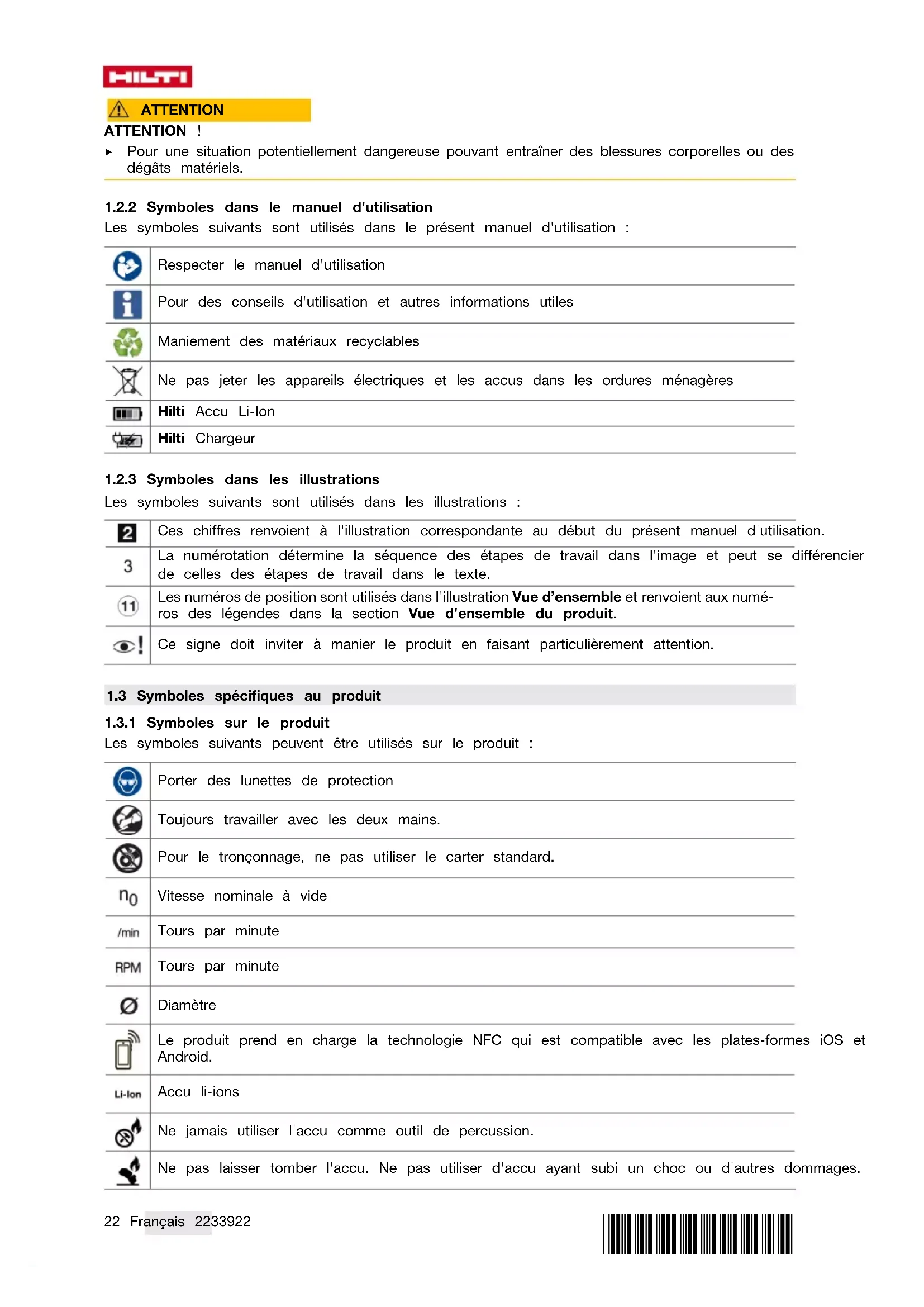 Les symboles suivants peuvent être utilisés sur le produit : Porter des lunettes de protection Toujours travailler avec les deux mains. Pour le tronçonnage, ne pas utiliser le carter standard. Vitesse nominale à vide Tours par minute Tours par minute Diamètre Le produit prend en charge la technologie NFC qui est compatible avec les plates-formes iOS et Android. Accu li-ions Ne jamais utiliser l'accu comme outil de percussion. Ne pas laisser tomber l'accu. Ne pas utiliser d'accu ayant subi un choc ou d'autres dommages.*2233922* 2233922 Français 23 Série de type d'accu Li-Ion Hilti utilisée. Observer les indications au chapitre Utilisation conforme à l'usage prévu. Si présent sur le produit, c'est que le produit a été certifié conformément aux normes en vigueur par cet organisme de certification pour le marché nord-américain et canadien.