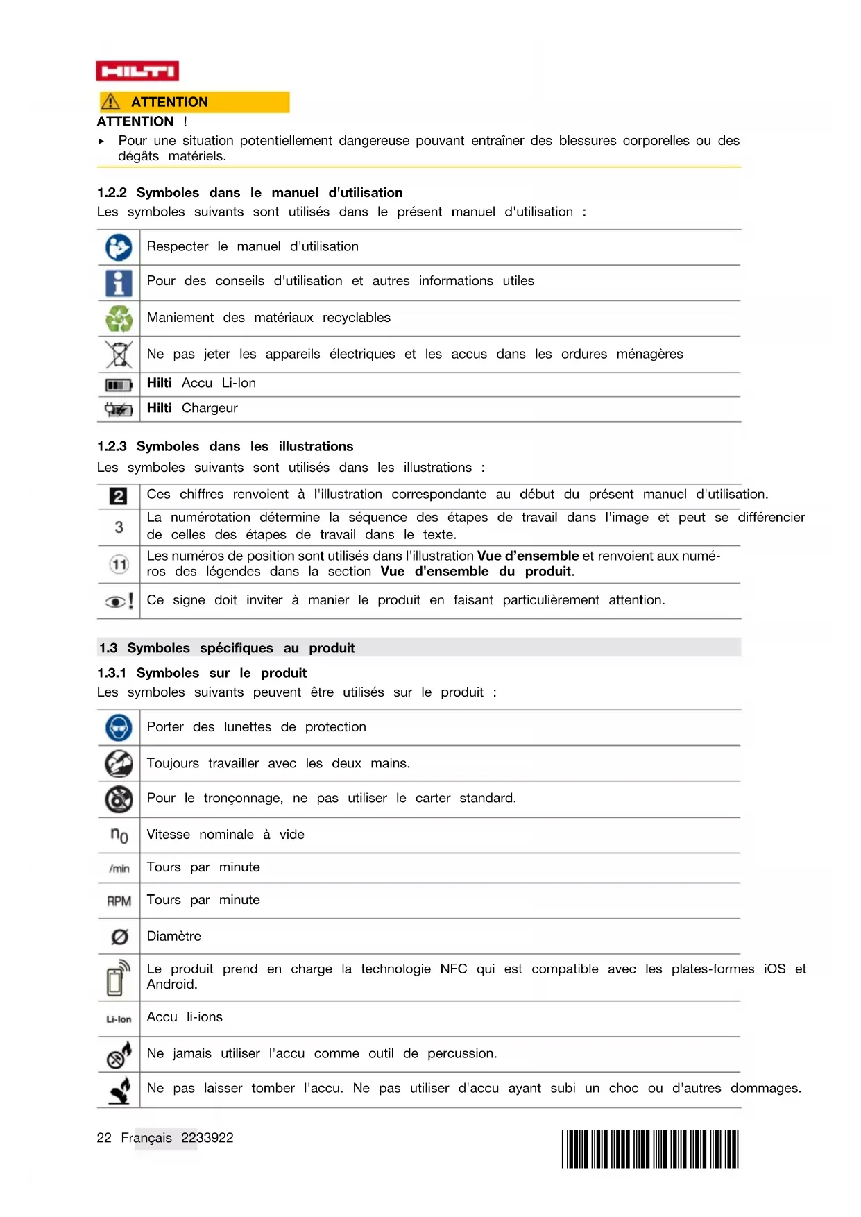 Les symboles suivants peuvent être utilisés sur le produit : Porter des lunettes de protection Toujours travailler avec les deux mains. Pour le tronçonnage, ne pas utiliser le carter standard. Vitesse nominale à vide Tours par minute Tours par minute Diamètre Le produit prend en charge la technologie NFC qui est compatible avec les plates-formes iOS et Android. Accu li-ions Ne jamais utiliser l'accu comme outil de percussion. Ne pas laisser tomber l'accu. Ne pas utiliser d'accu ayant subi un choc ou d'autres dommages.*2233922* 2233922 Français 23 Série de type d'accu Li-Ion Hilti utilisée. Observer les indications au chapitre Utilisation conforme à l'usage prévu. Si présent sur le produit, c'est que le produit a été certifié conformément aux normes en vigueur par cet organisme de certification pour le marché nord-américain et canadien.