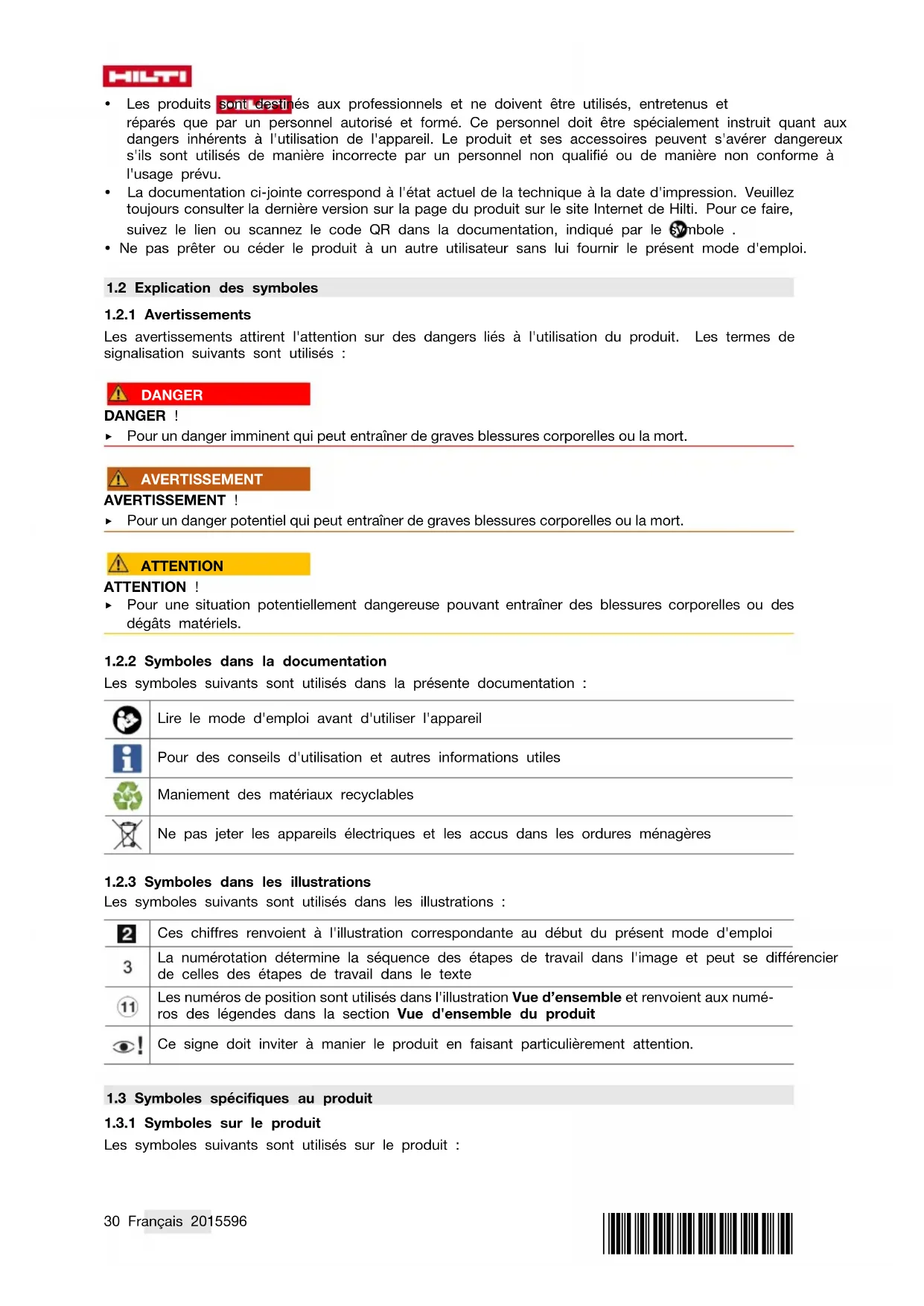 - La documentation ci-jointe correspond à l'état actuel de la technique à la date d'impression. Veuillez toujours consulter la dernière version sur la page du produit sur le site Internet de Hilti. Pour ce faire, suivez le lien ou scannez le code QR dans la documentation, indiqué par le symbole .