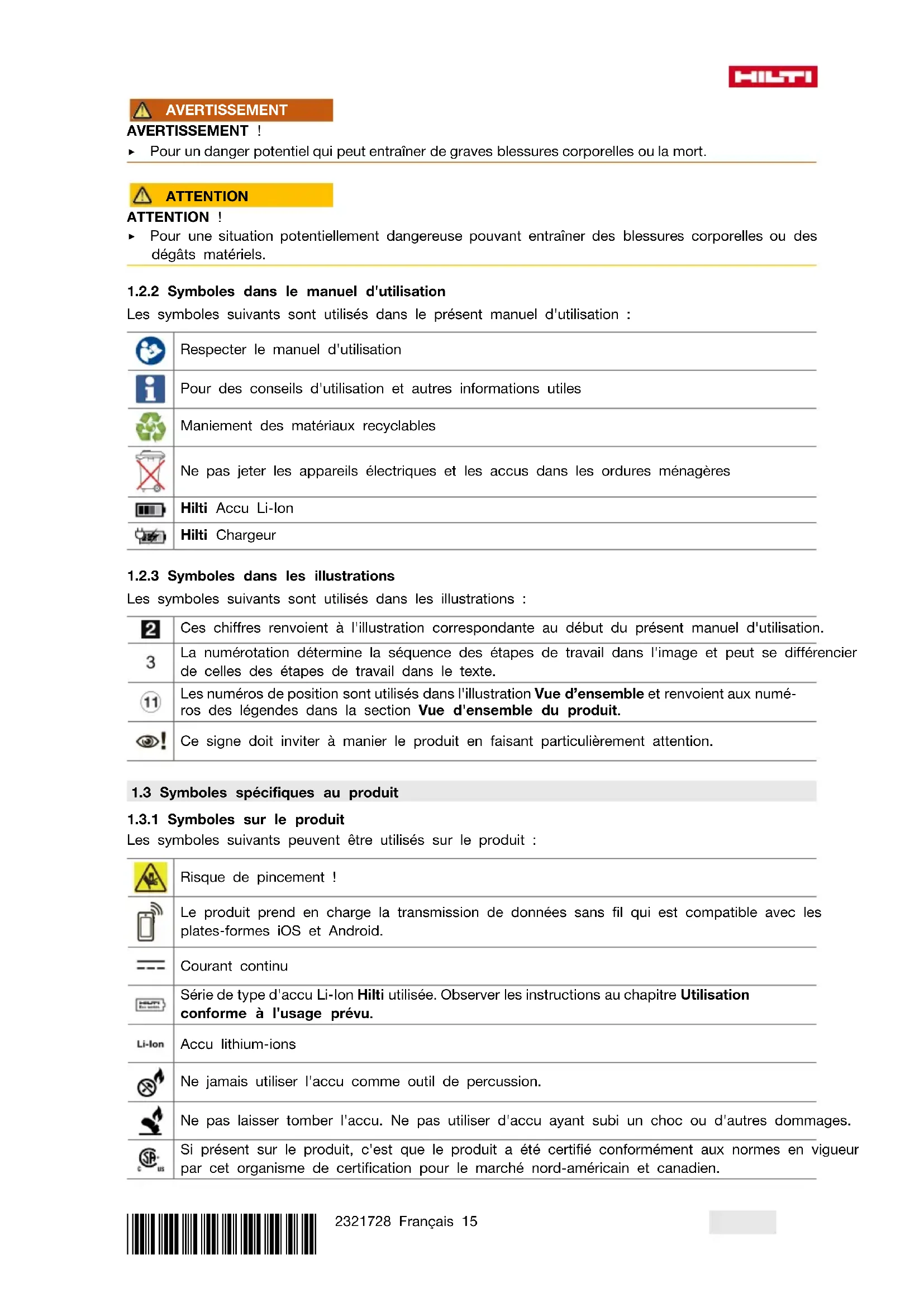 Les symboles suivants peuvent être utilisés sur le produit : Risque de pincement ! Le produit prend en charge la transmission de données sans fil qui est compatible avec les plates-formes iOS et Android. Courant continu Série de type d'accu Li-Ion Hilti utilisée. Observer les instructions au chapitre Utilisation conforme à l'usage prévu. Accu lithium-ions Ne jamais utiliser l'accu comme outil de percussion. Ne pas laisser tomber l'accu. Ne pas utiliser d'accu ayant subi un choc ou d'autres dommages. Si présent sur le produit, c'est que le produit a été certifié conformément aux normes en vigueur par cet organisme de certification pour le marché nord-américain et canadien.16 Français 2321728 *2321728*
