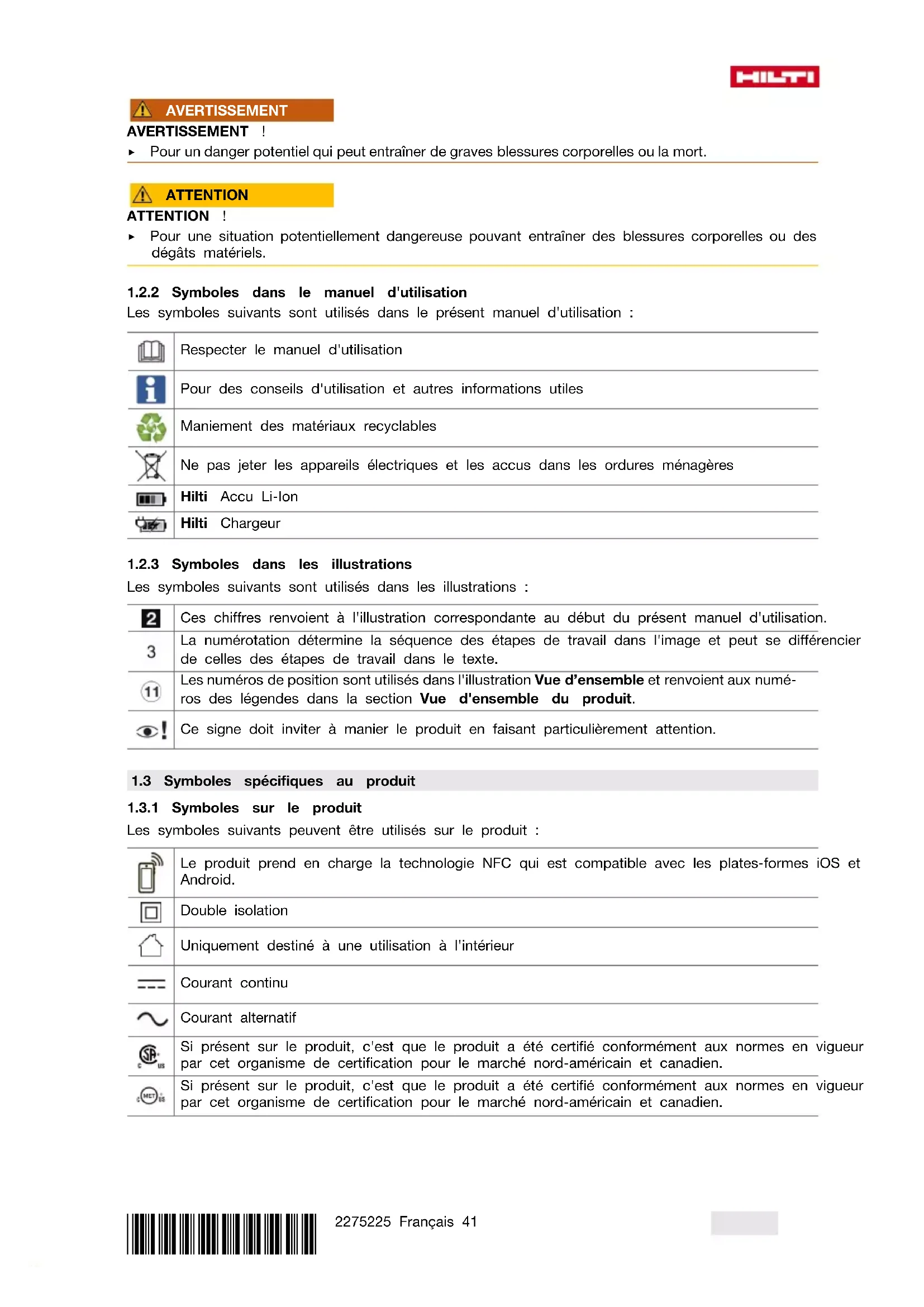 Les symboles suivants sont utilisés dans le présent manuel d'utilisation : Respecter le manuel d'utilisation Pour des conseils d'utilisation et autres informations utiles Maniement des matériaux recyclables Ne pas jeter les appareils électriques et les accus dans les ordures ménagères Hilti Accu Li-Ion Hilti Chargeur